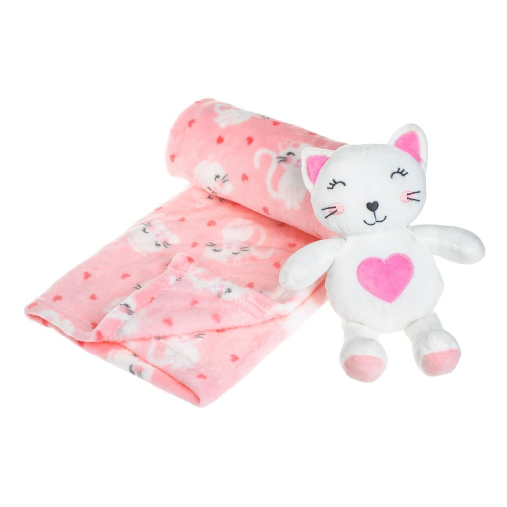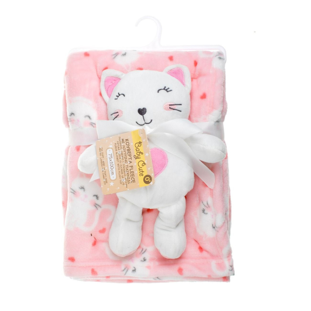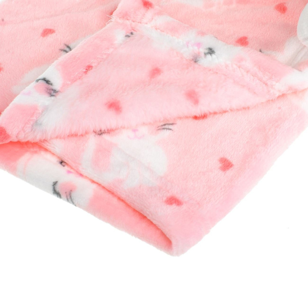 Бебешко поларено одеяло Коте с плюшена играчка, Двулицево 100x75 cm, Розово
