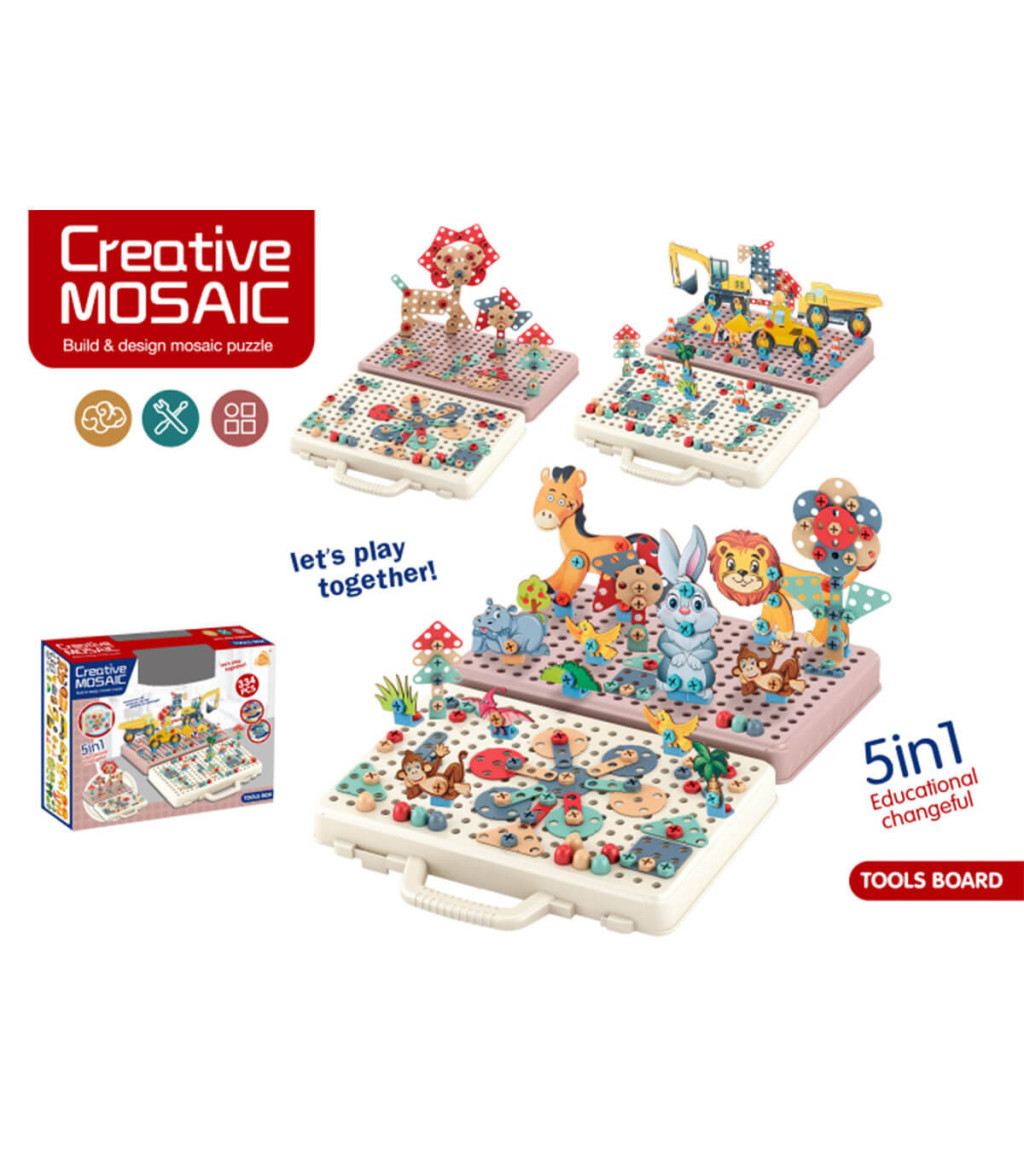 Цветен и забавен конструктор-мозайка, събран в удобно пластмасово куфарче с перфорация. Съдържа общо 334 елемента – 1 бр. гаечен ключ, 1 бр. отвертка, 1 бр. електрически винтоверт, 60 бр. шарени пинчета, 3 бр. макети на динозаври и какво ли още не! Опитайте се да сглобите модулите, както е показано в книжката с идеи, а защо не и нещо различно! · Брой части: 334 · Размери на опаковката в см: 31 х 7 х 25 · Материал: нетоксична пластмаса · Подходящо за деца над 3 год. · Произведено в Китай