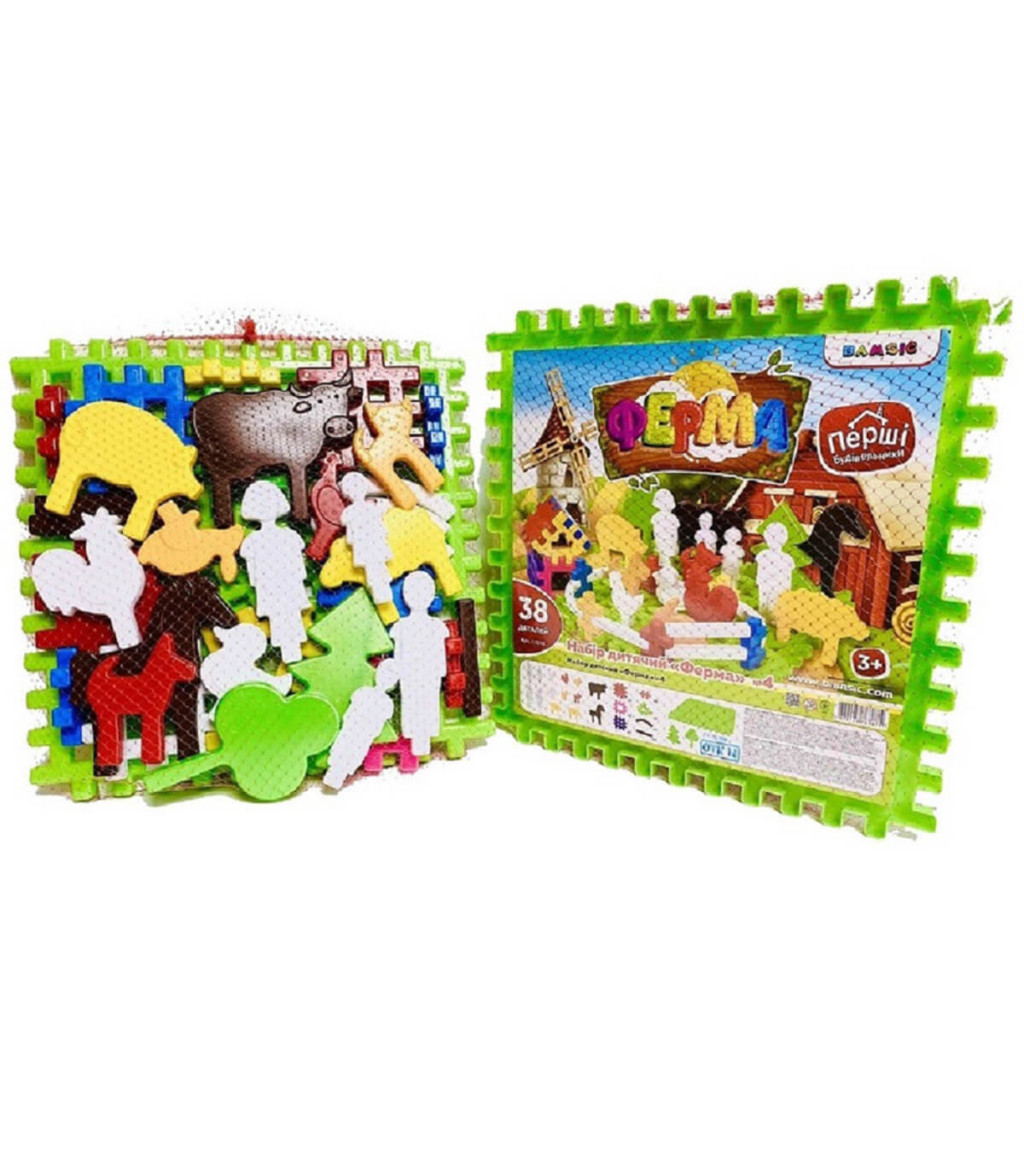 Конструктор Ферма от 38 части. Състои се от вафлена основа за нареждане, вафлени оградни блокчета, различни фермерски и домашни животни, фигурки на хора, дръвчета. Подходящо за момичета и момчета над 3 години и чудесен подарък за повод или без. Опаковка: мрежа и фолио. · Размери на опаковката в см: 36 х 6 х 36 · Материал: нетоксична пластмаса · Подходящо за деца над 3 год. · Произведено в Китай