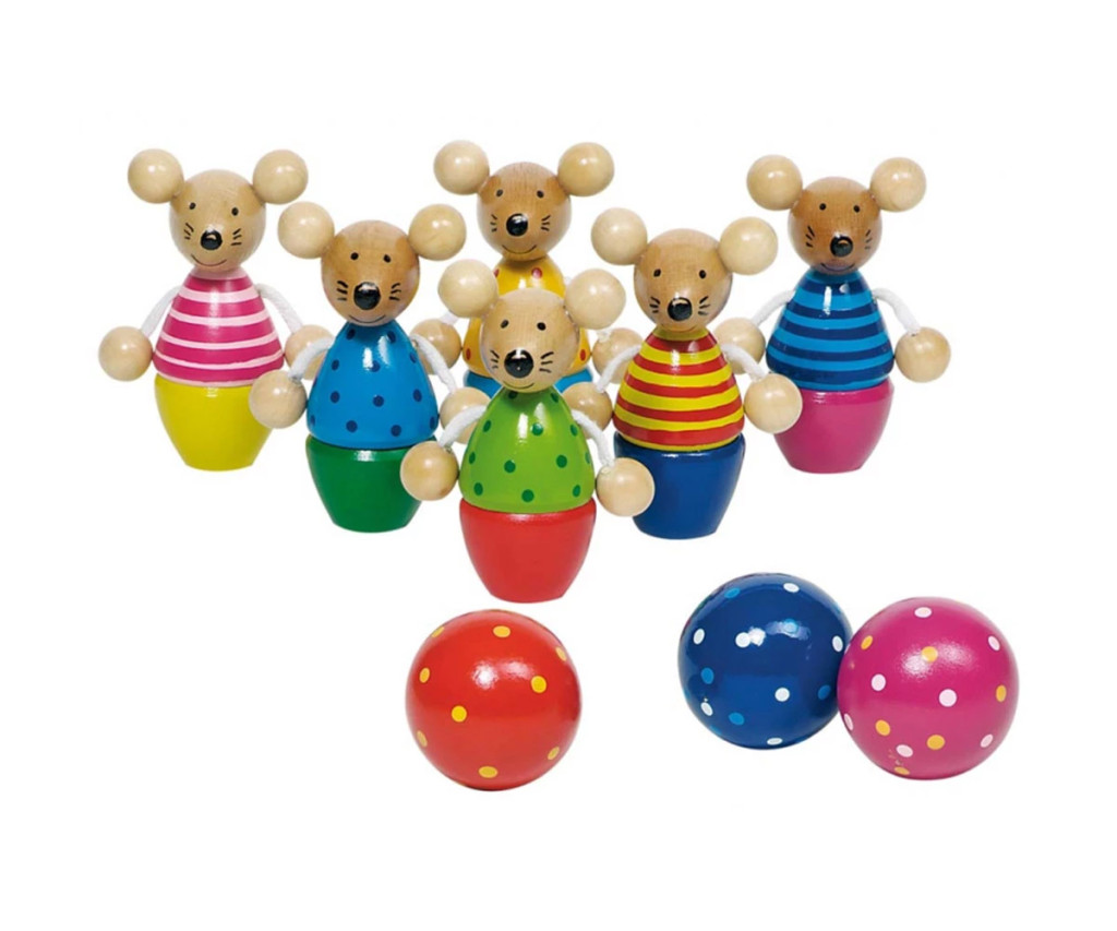 Дървена игра БОУЛИНГ с 6 кегли - Мишлета и 3 топки Goki, 19х 4.5х5 см.