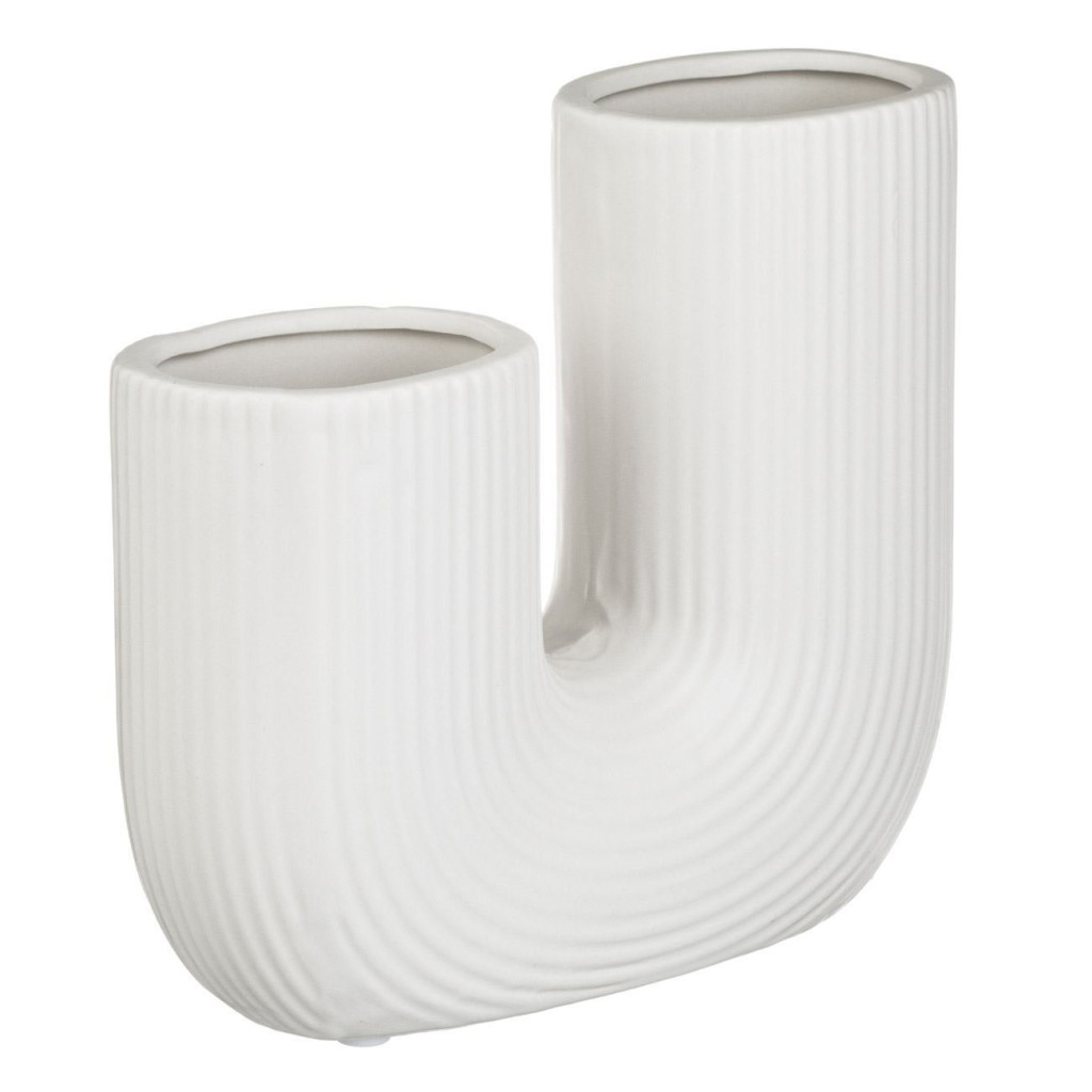 Декоративна керамична ваза, бяла, с форма на подкова и релефни линии, 18x6x16.5 см