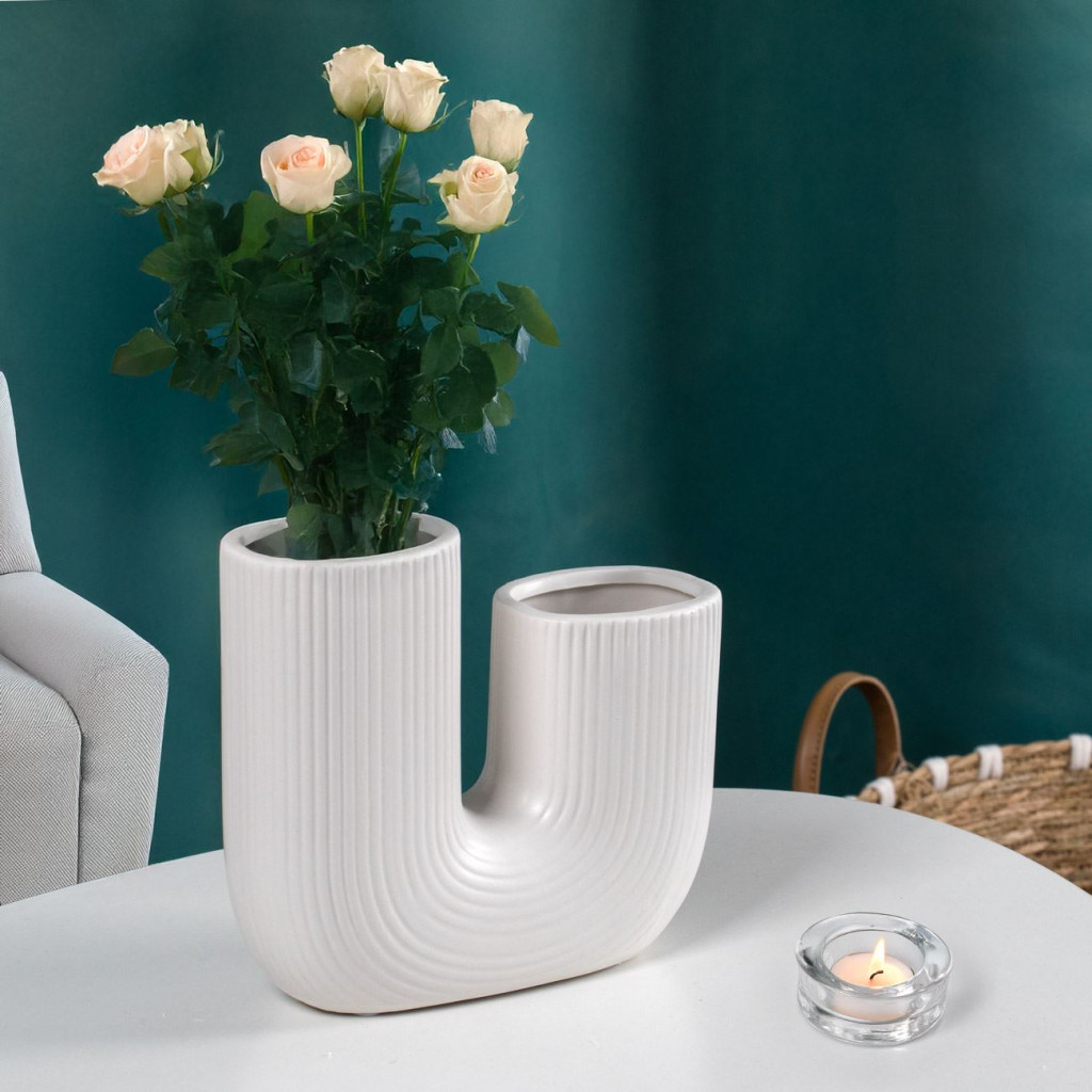 Бяла, керамична, декоративна ваза във формата на подкова с несиметрични части и релефни линии. Има неплъзгащо се дъно.
