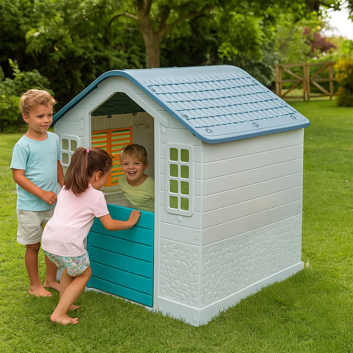 Малчуганите ще могат да се забавляват часове наред с градинската къщичка от Dolu. Тя има елегантен дизайн, в нюанси на бяло и тюркоазено, като може да се постави както извън, така и вътре в къщата.