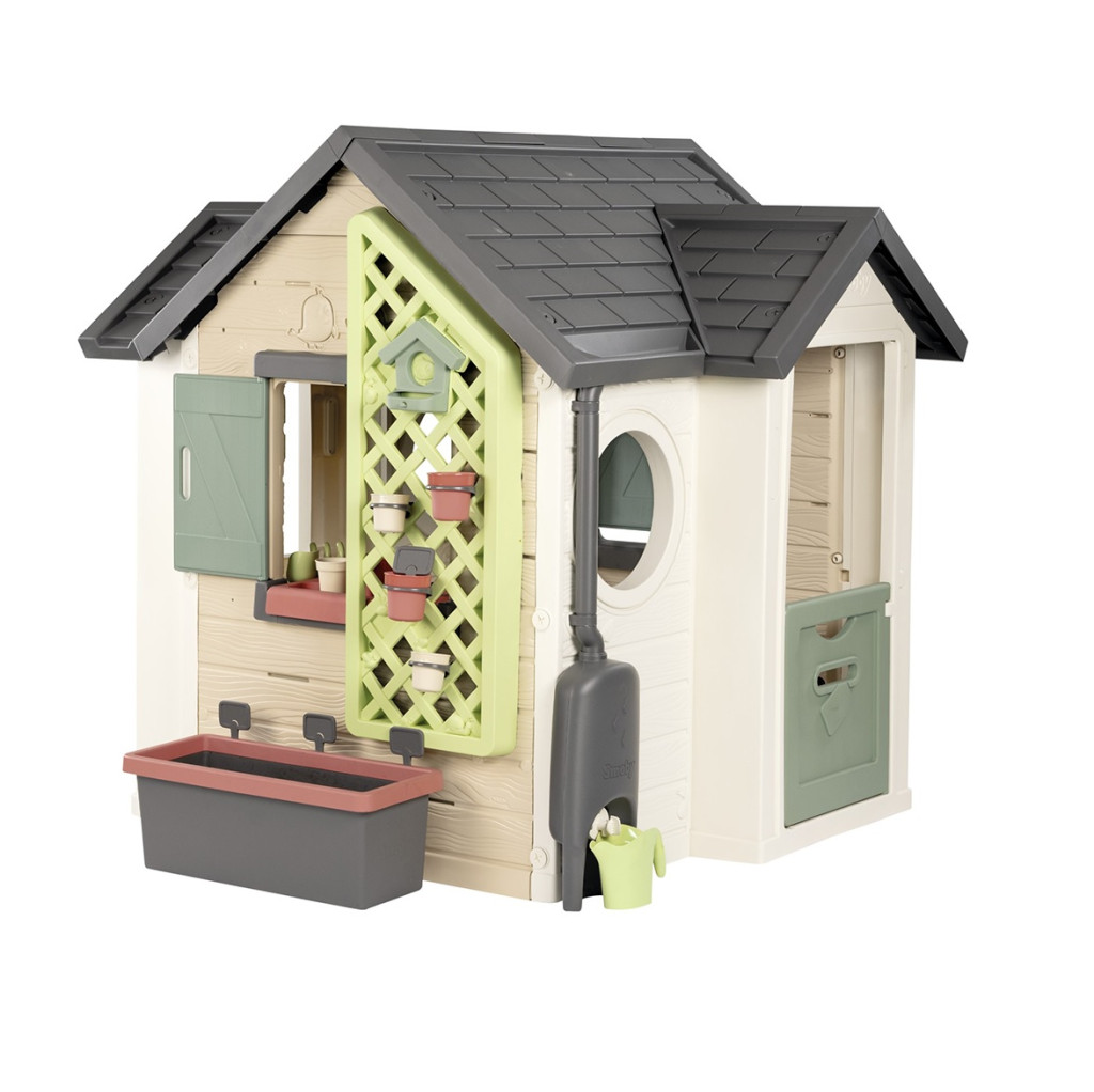 Снабдена с 1 порта, 2 прозореца с капаци на панти и 2 илюминатора, Garden House има и много функции за игра: голяма саксия, пергола за окачване на малки саксии и хранилка за птици, както и колектор за вода с лейка.