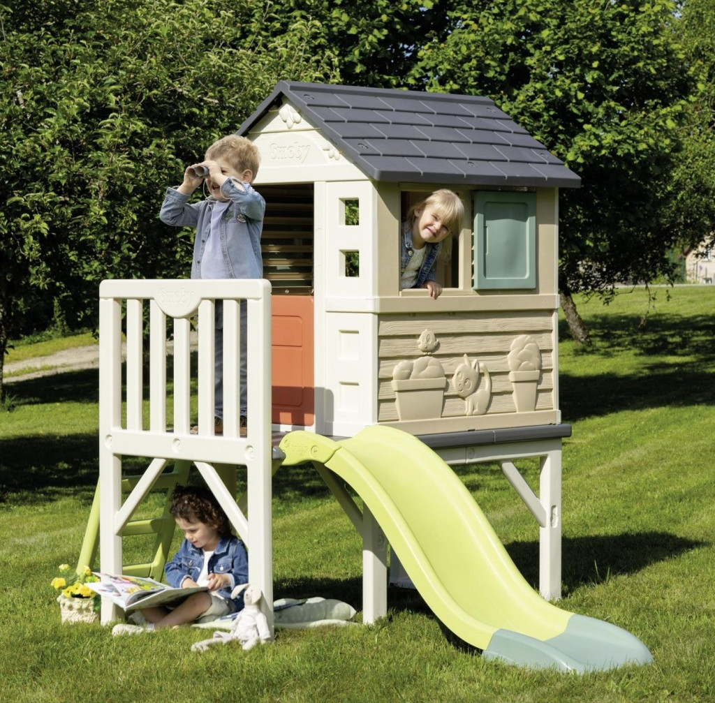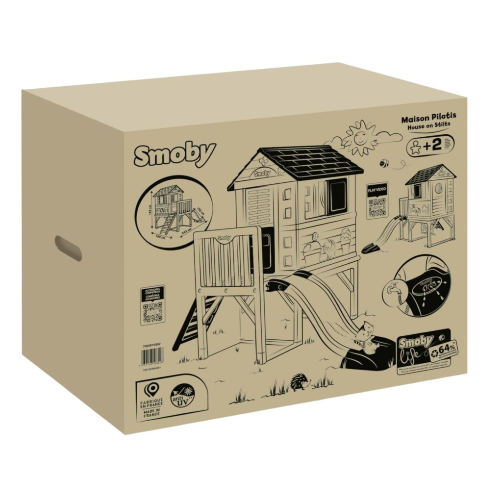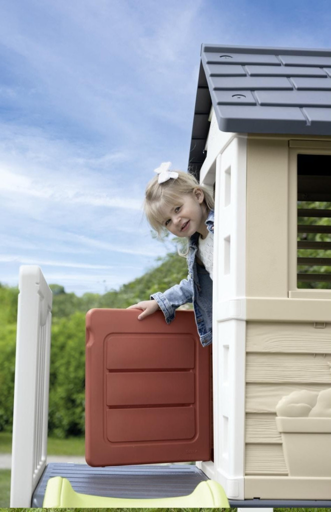 Разположена на стабилна платформа с височина 70 cm, къщичката предлага множество забавни елементи – половин входна врата, две прозорчета с подвижни капаци, кръгъл прозорец и два плъзгащи се капака, които позволяват на децата да изследват и създават собствени сценарии за игра.
