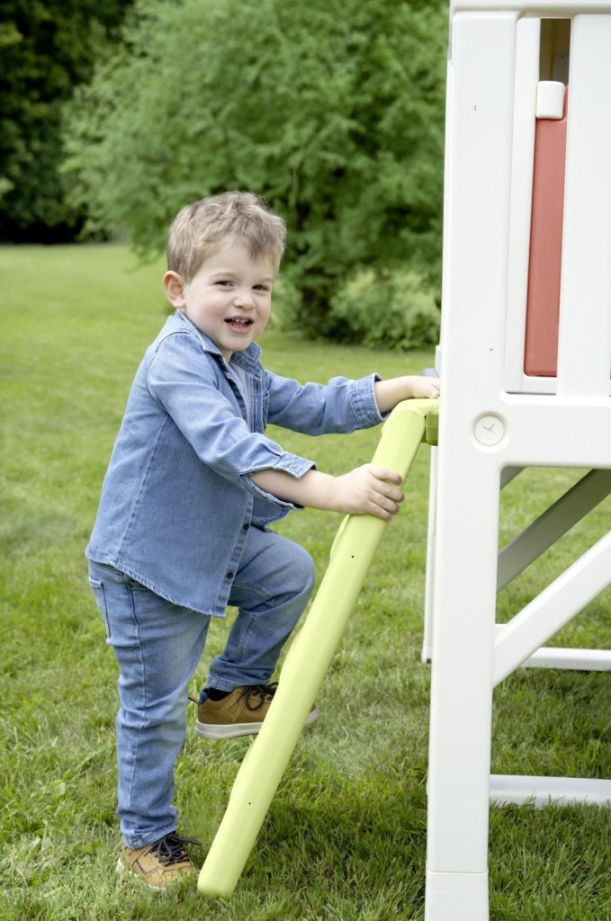 Достъпът до верандата става чрез малка стълба, а забавлението продължава със свежо интегрирана пързалка с дължина 150 cm.