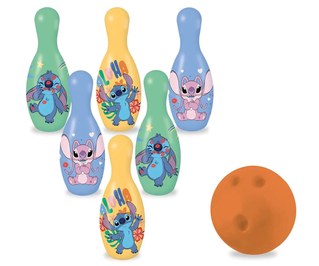 Открий магията на боулинга с 6 пъстри кегли и 1 топка с весели изображения на Стич – перфектен за деца над 3 години!