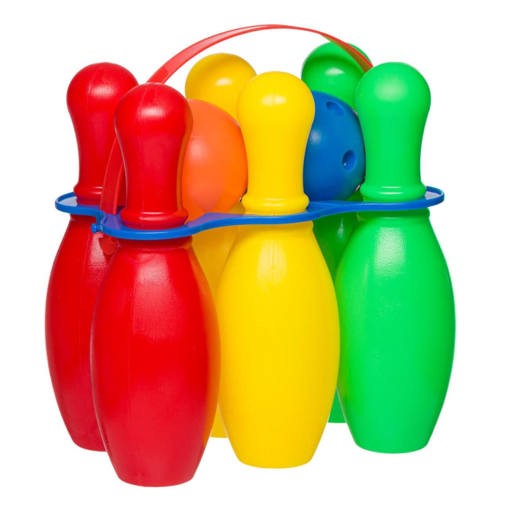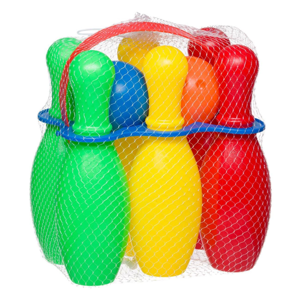 Детски комплект за боулинг с 6 цветни кегли (22 см) и 2 цветни топки (6 см).