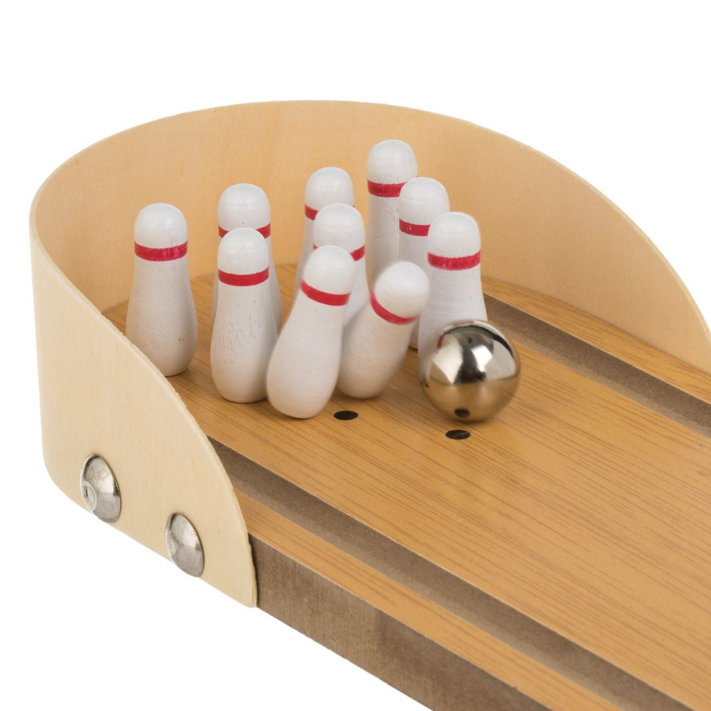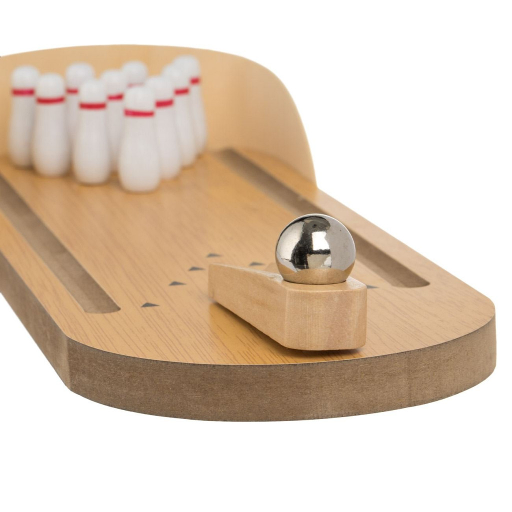 Играйте любимата си игра в миниатюрен вариант! Дървена настолна игра боулинг за 2 играчи. Подредете кеглите и се прицелете. Страхотно забавление в компактен настолен размер.