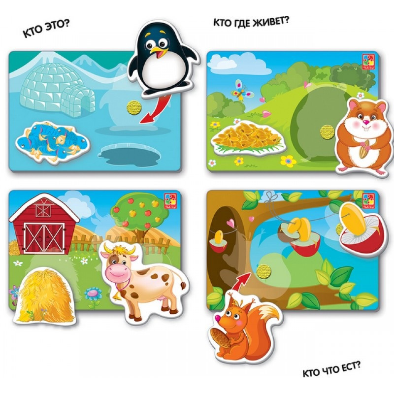 Прикрепете всяко животно към картинката, която съответства на мястото му на пребиваване, с помощта на велкро. Например, изпращаме кравата във фермата, а катерицата на дървото. Но това не е всичко. Всяка къщичка има любима храна на животните. Разберете какво обичат да ядат.