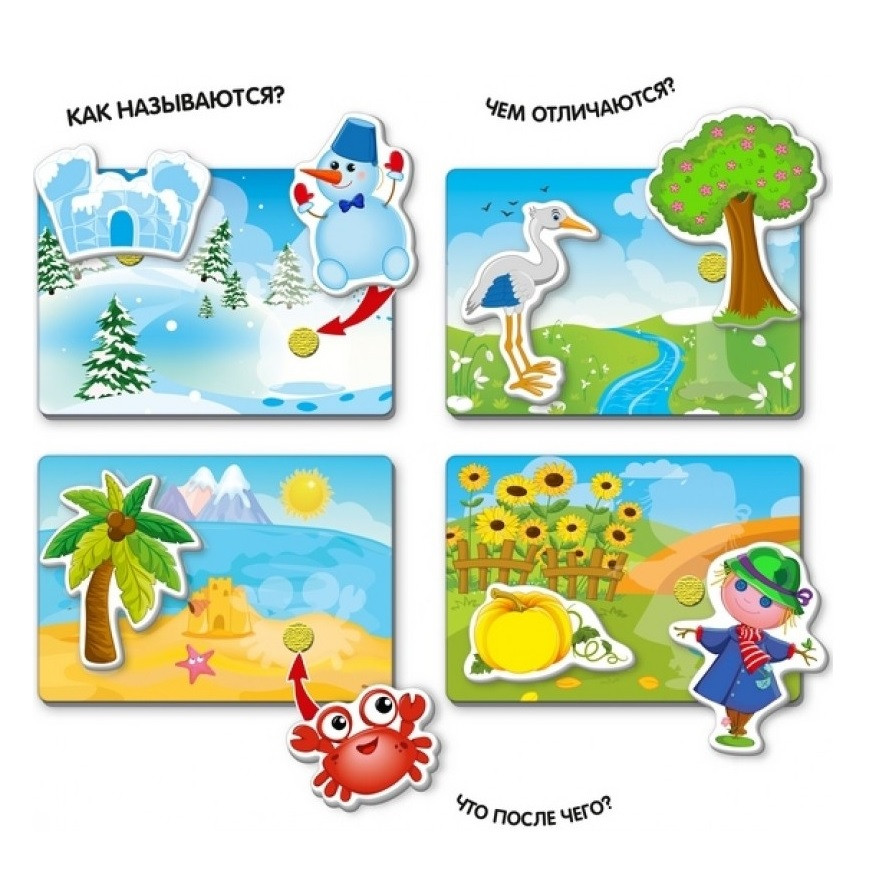в комплекта има 4 полита за игра на всяко е изобразен един годишен сезон детето трябва да се досети кой сезон е нарисуван и да прикрепи към полето предметите които му съответстват в тази задача ще му помогнат веселия рак и щъркела и други животни