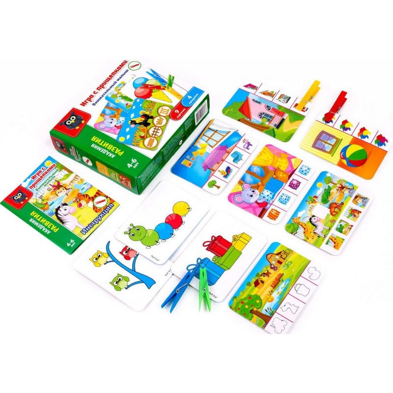 Картите съдържат задачи и опции за отговори. Детето трябва да ги изпълни и да отбележи отговорите с щипки за дрехи. От другата страна на картите има картинки в четири цвята. Необходимо е да свържете щипките за дрехи заедно, така че да се пресъздаде картината.