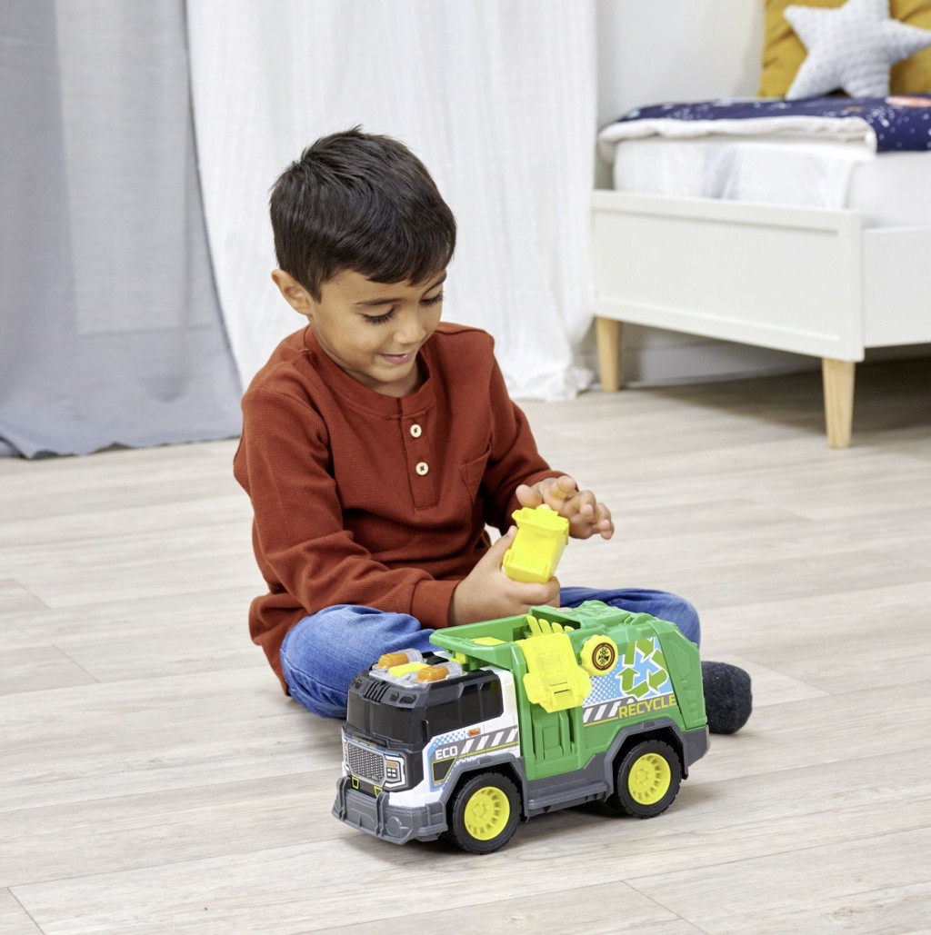 Голям боклукчийски камион с функции и аксесоари! Идеален за деца на възраст 3+ с вградени светлинни и звукови ефекти. Децата ще се забавляват с детайлите и интересните игрови възможности! Децата могат да поставят малки предмети в горната част на контейнера и да ги транспортират в кабината на камиона чрез завъртащото се колело. Жълтият контейнер, който идва с камиона, може да се закачи отстрани, да се повдигне и изсипе в коша - капакът на контейнера се отваря автоматично. С дължина от 30 см и свободно движещи се колела, този детски камион е идеален за момчета и момичета. Интерактивните функции развиват фината моторика, координацията око-ръка и креативността на децата, като същевременно повишават осведомеността за опазването на околната среда. Реалистичните звуци на работа, сигналите при заден ход и звуците при изхвърляне на контейнера, както и ярката оранжева предупредителна светлина, правят играта още по-вълнуваща. Всички необходими батерии са включени.