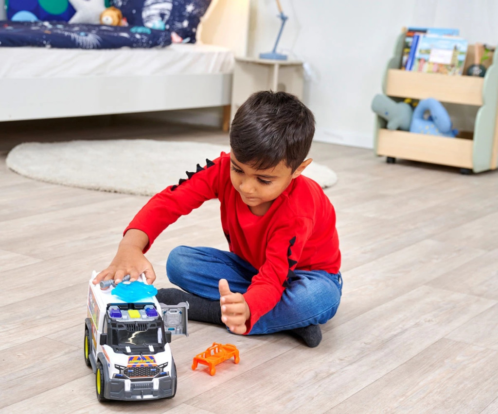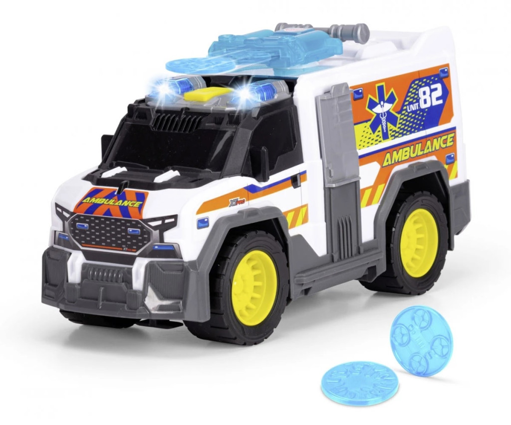 С впечатляващ размер от 30 см, тази детайлна линейка предлага множество функции за вълнуващи пътувания и мисии по оказване на първа помощ. Свободното въртене на колелата позволява на спасителното превозно средство да се движи без усилия по пода, така че да може да преминава през детската стая до местопроизшествието с бързината на светлината. На покрива на играчката има изстрелвачка, който може да изстреля включените сини дискове: те изглеждат като вода, за да могат малките лекари сами да решават какво действие е необходимо за тяхното приключение! Линейката за първа помощ има странично отделение и задна врата, която удобно се преобразува в рампа - идеална за бързо натоварване и разтоварване на предоставената носилка. Мигащата синя светлина и реалистичните звуци от запалване на двигателя, шофиране и впечатляваща сирена правят всяка спасителна ситуация още по-вълнуваща. Благодарение на предоставените батерии, играчката е готова за незабавна употреба от деца над 3 години.