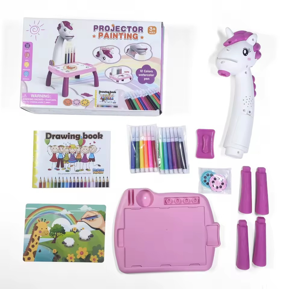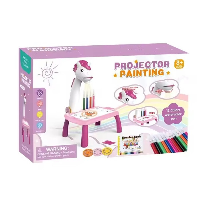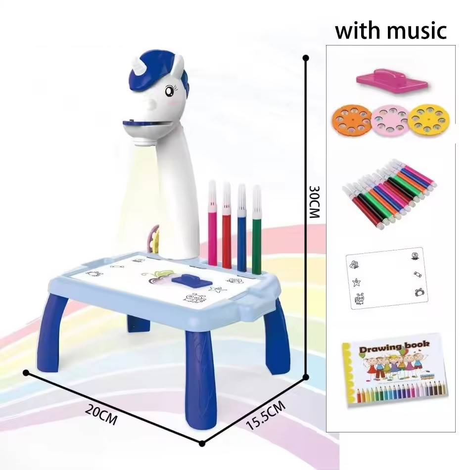 Тази маса за рисуване за деца е оборудвана с иновативен проектор и различни шаблони, които стимулират въображението и креативността на най-малките.
