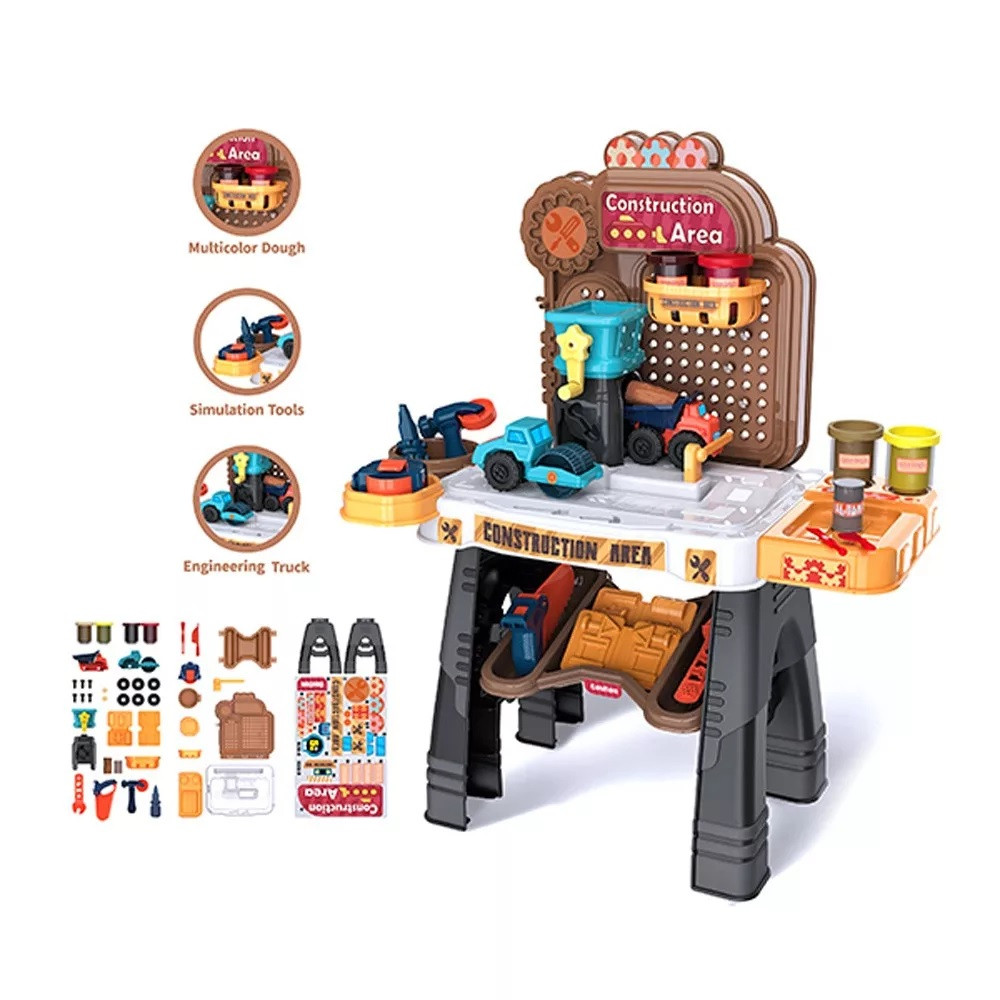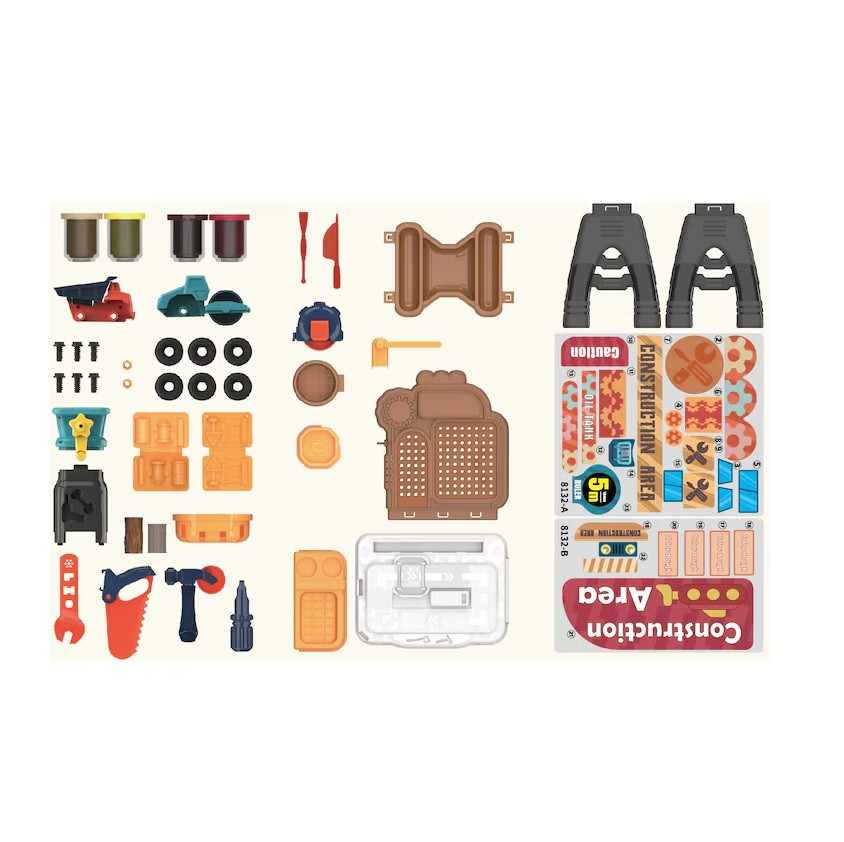 Комплектът съдържа сглобяема работна маса с инструменти (отвертка, ключ, трион-преса), 4 цвята моделин, прибори и форми за моделиране, камион валяк, камион самосвал и ръчна мелница за моделин.