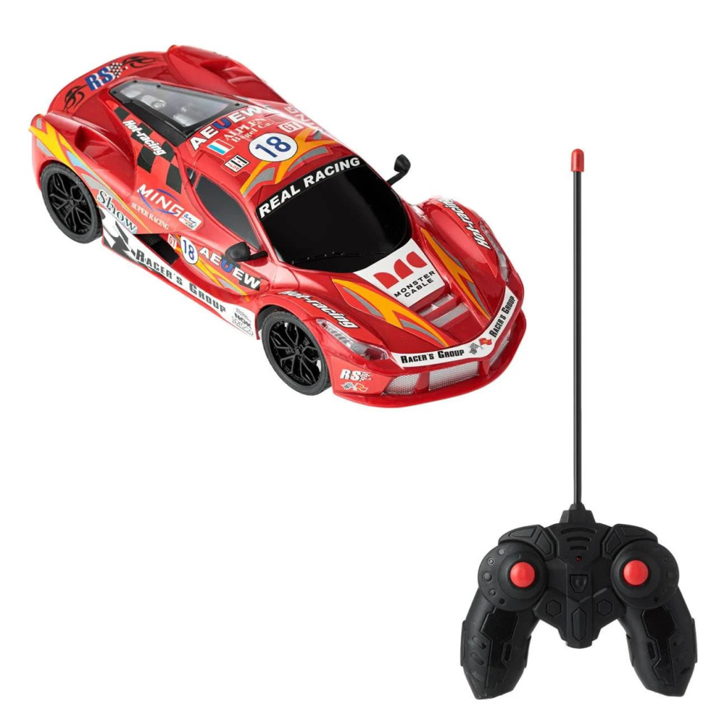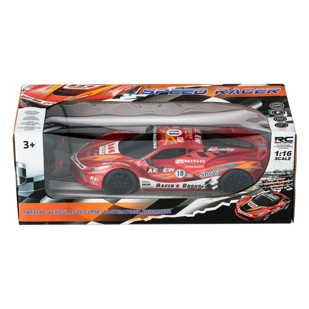 Червен състезателен автомобил с дистанционно управление с батерии в мащаб 1:16, с 27MHz многопосочно управление, стопове и светлини.
