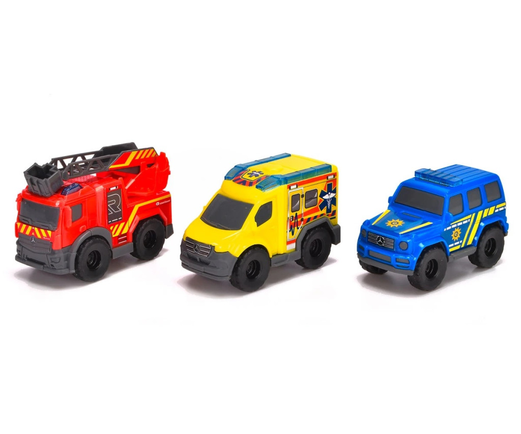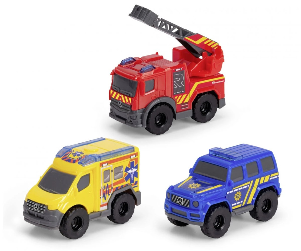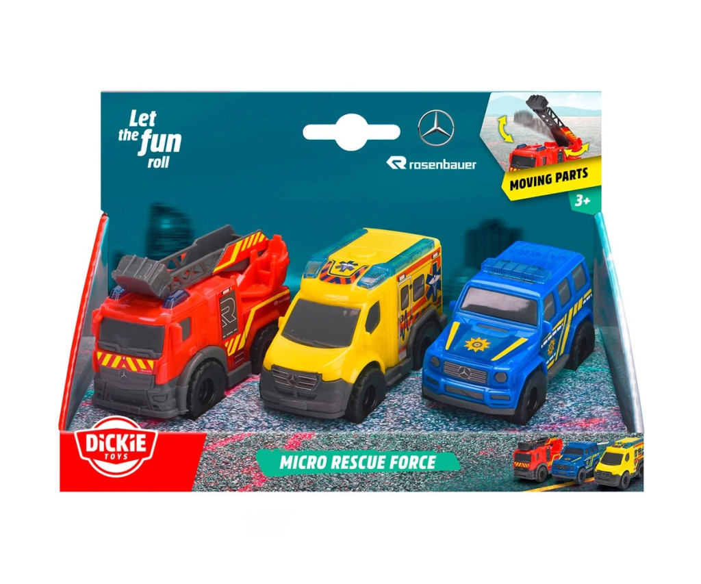 Dickie Toys - Играчки коли Micro Rescue Force (8 см всяка) - комплект от 3 коли Mercedes-Benz със свободно въртене на колелата и подвижни части за деца над 3 години: пожарна кола, полицейска кола и линейка. Micro Rescue Force: малки коли за големи приключения! Трите най-популярни спасителни превозни средства комбинирани в един комплект играчки: Micro Rescue Force се състои от ярко червена пожарна кола, синя полицейска кола и жълта линейка за парамедици. Всяко превозно средство е проектирано в удобен размер от 8 см в ярки цветове с много детайли. Готови ли сте за вълнуващи спасителни мисии в детската стая? Геройският екип от мини състезатели вече е на старта! Пожарната кола Mercedes-Benz Antos, полицейският SUV Mercedes-Benz G-Class и линейката Mercedes-Benz Sprinter са официално лицензирани миниатюрни версии на превозни средства Mercedes-Benz - адаптирани към нуждите на деца над 3 години. Играчките се движат на свободно въртящи се колела и са здраво изградени, за да могат да издържат дори на най-смелите приключения на малките спасители. Особено вълнуващо: Пожарната кола разполага с подвижна стълба, която помага на пожарникарите в спешните им мисии! Малки SOS превозни средства, голямо действие: Комплектът от 3 коли предлага безкрайни възможности за игра на момичета и момчета и ги насърчава да приемат ролята на смели герои в ежедневието!