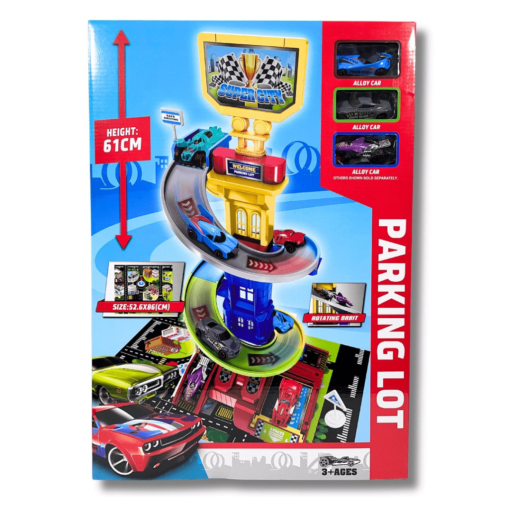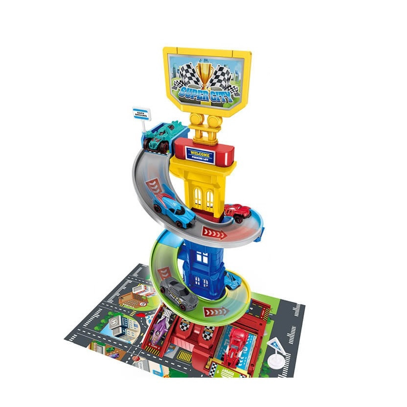Детски комплект Паркинг-Кула, 3 нива, 3 метални колички, 37 х 9 х 53 см, 3+ години