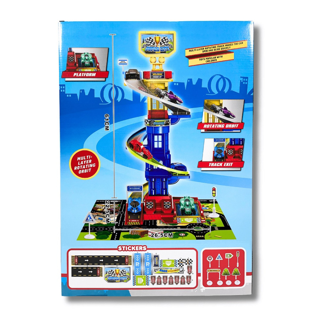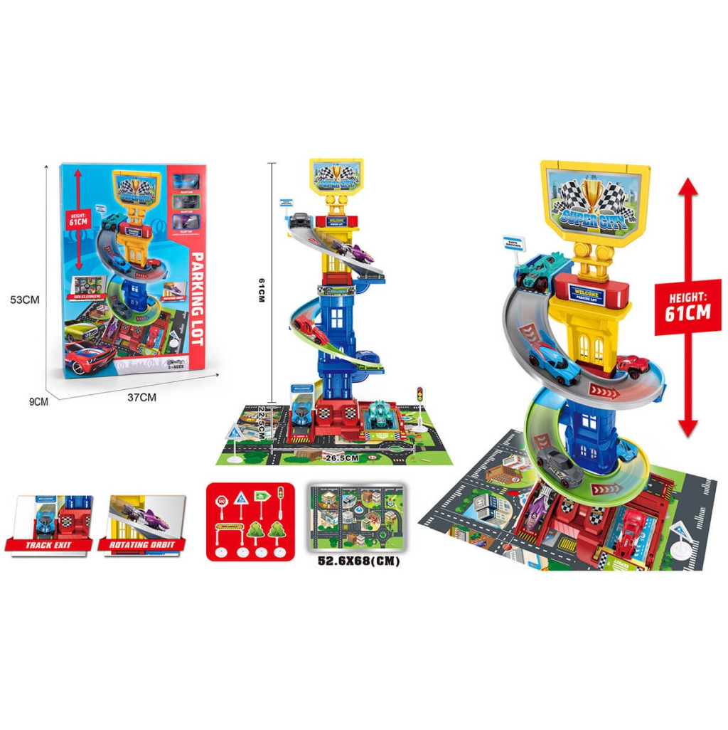 Детски комплект за игра с писта-пързалка, 3 метални колички, игрално поле с градска среда, указателни знаци и лепящи стикери.