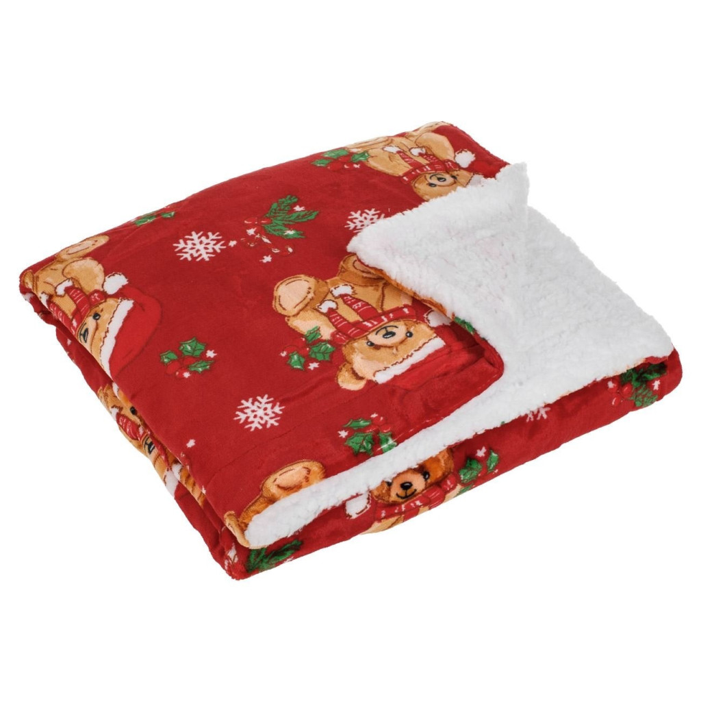 Коледно бебешко одеялце с кадифена текстура и много меко докосване. В червен цвят с дизайн на мечета и вътрешна страна от бял шерпа плат.