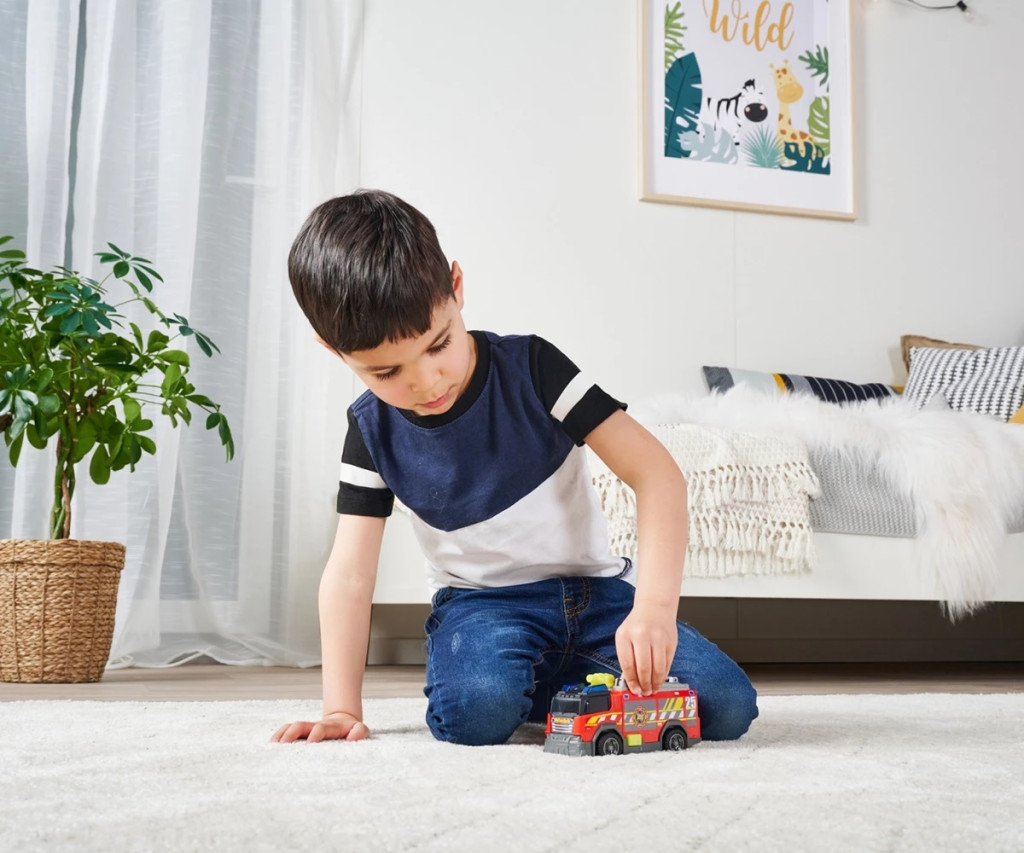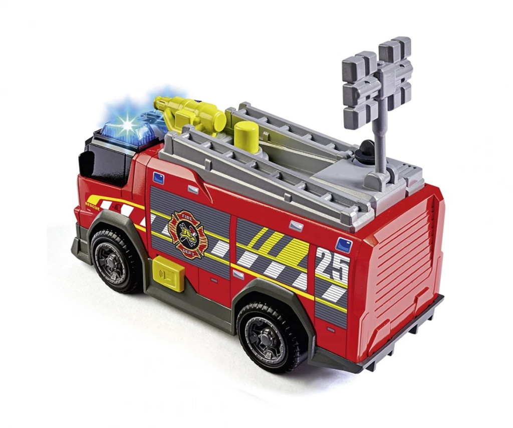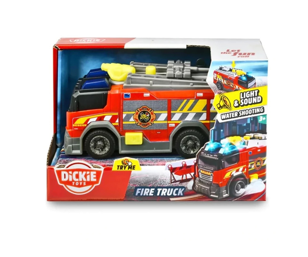 Побързайте към мястото на пожара с пожарната кола на Дики и загасете огъня! Можете също така да се движите по-бързо в задръстванията със светлинни и звукови ефекти. Просто натиснете бутона отстрани на колата и автомобилистите пред вас ще ви забележат и ще се дръпнат встрани! Въртящата се телескопична стълба е подобрена от светлинни и звукови ефекти. Плъзгащият механизъм за свободен ход гарантира, че пожарната кола ще стигне бързо до мястото на пожара.