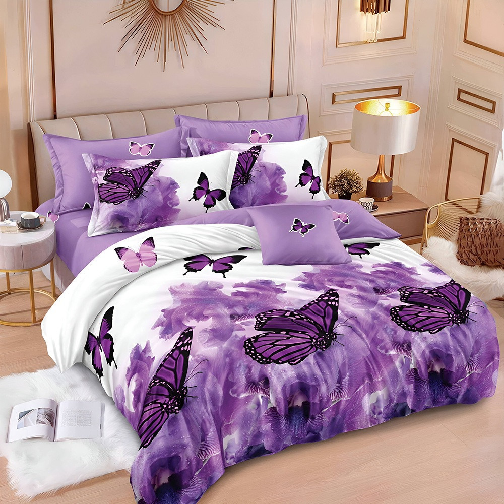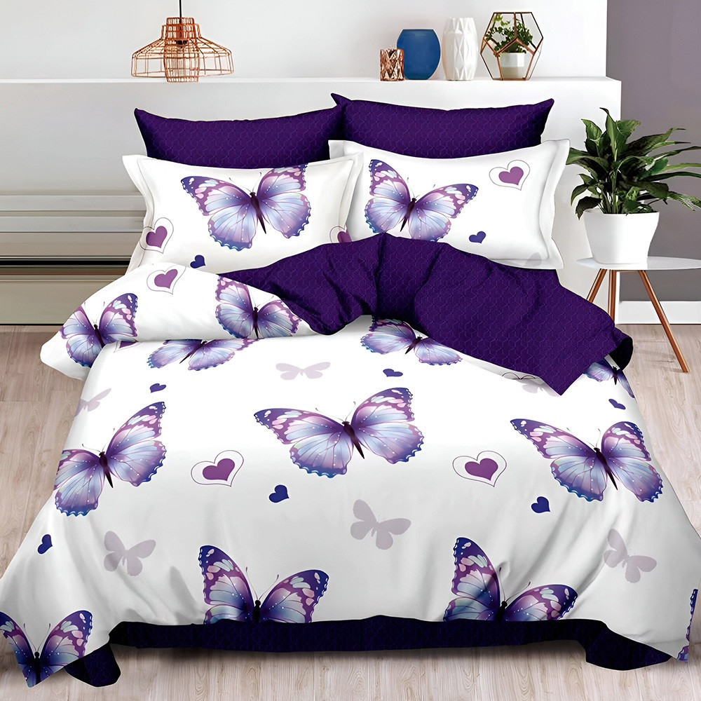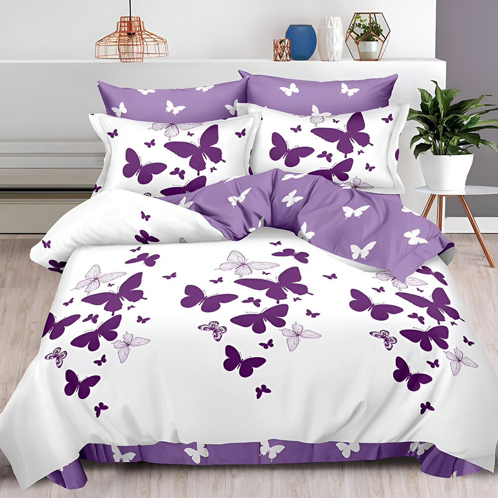 Двулицево спално бельо с ластик Пеперуди, 6 части, 18523/18536. 200 x 230 см, Бяло/Лилав