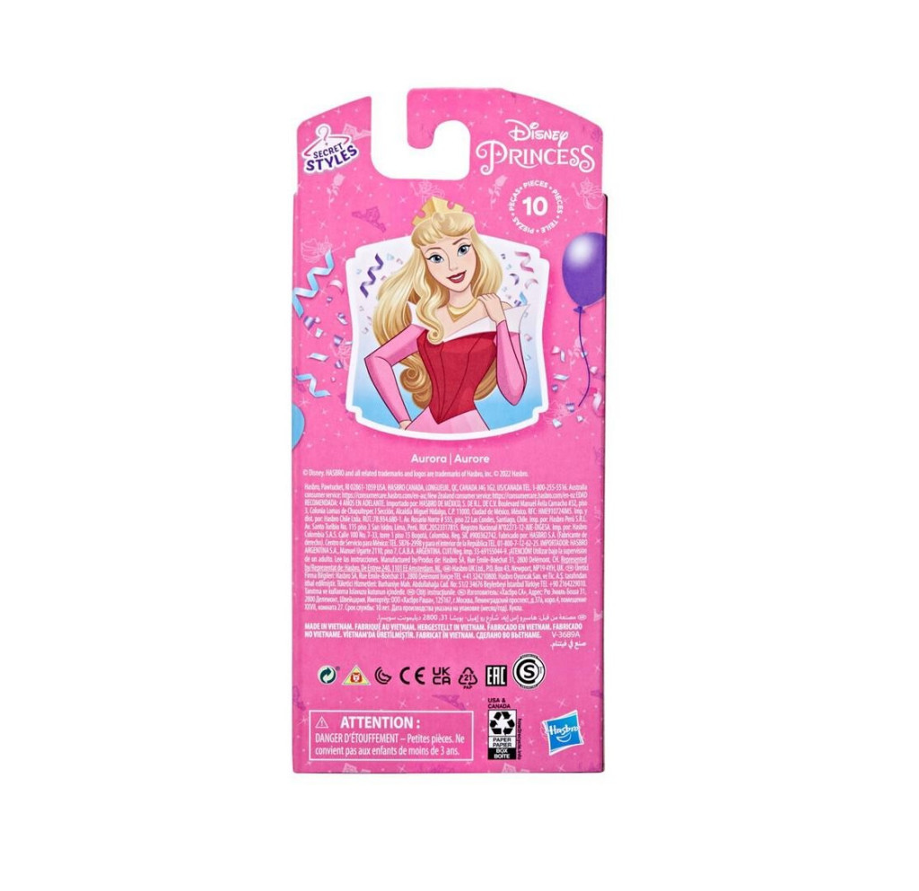 Децата могат да обличат Аврора, смелата героиня от Спящата красавица на Дисни, в 2 различни меки, гъвкави тоалета от 2 части, вдъхновени от филма и чифт обувки, които ще намерят вътре. Има дори портмоне и колие, които да завършат нейната визия. Този комплект с парти тема включва също парче торта и аксесоари за кутия за подаръци, така че децата могат да си представят, че Аврора организира празнично тържество за всичките си приятели. Fashion Surprise Aurora е страхотен подарък за деца на 4 и повече години, а те също могат да потърсят повече кукли и комплекти за игра Disney Princess Secret Styles с герои като Жасмин и Рапунцел за повече забавление при откриването на мода.