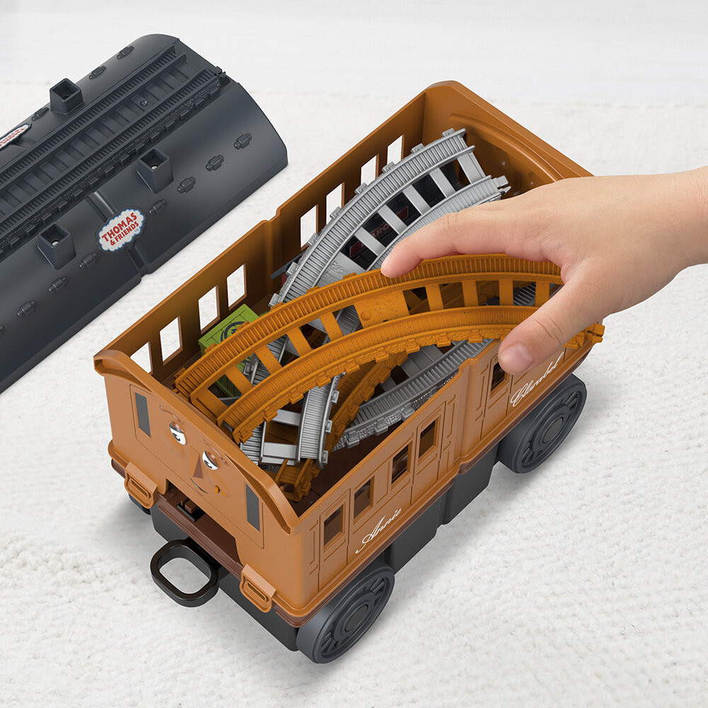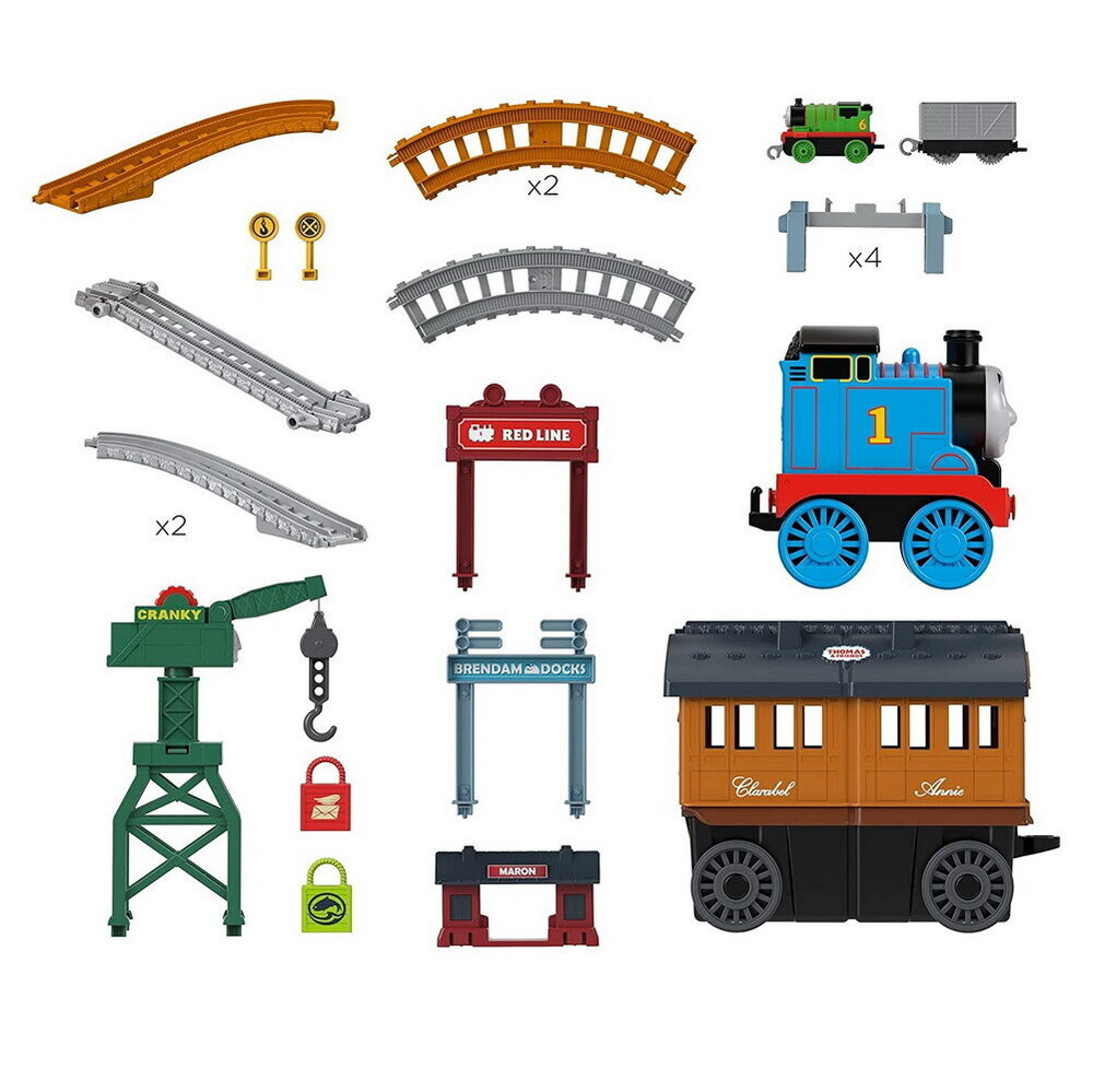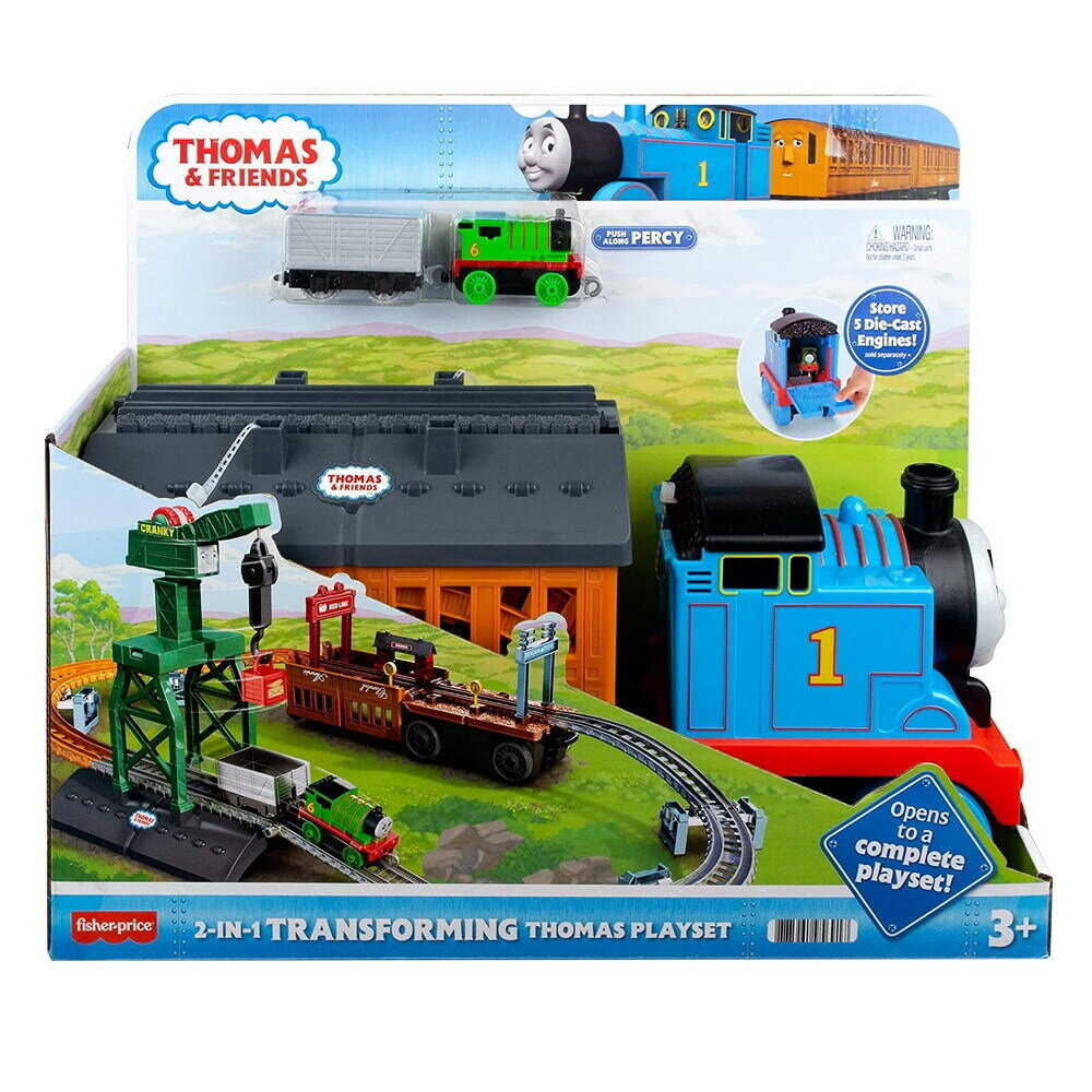 Модел GXH08 Transforming Thomas 2in1 Trakmaster Thomas and Friends. Подходящо за деца над 3год.Децата могат да създадат свои вълнуващи железопътни приключения с този комплект влакове на Thomas & Friends 2-в-1 TrackMaster, включващ 20+ парчета релси, които изграждат едно трасе за предвижване на локомотивчето Пърси.*Голям движещ се Томас, в който могат да се превозват и съхраняват метални локомотиви, както и големи вагони, Ани и Кларабел, които се отварят, за да разкрият всички парчета, от които децата ще се нуждаят, за да построят железопътна линия!Комплектът включва:*20 парчета релси, 1 голям двигател Thomas, пътнически вагони Annie и Clarabel*Локомотив Пърси с вагон*Кранът КранкиЗа деца над 3 години