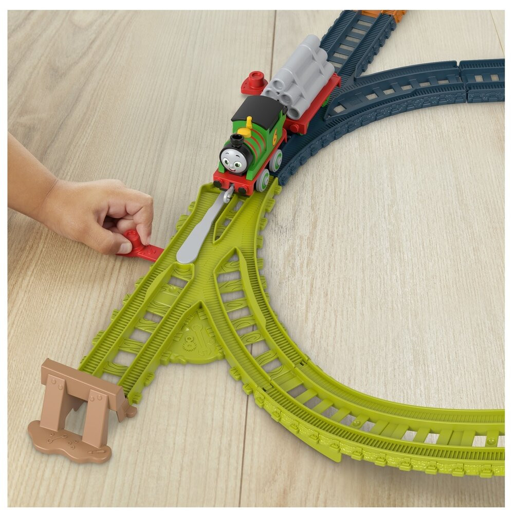 Комплектът идва с аксесоари като:- мост и депо за товаро-разтоварни дейности за вълнуваща железопътна игра- 1 локомотив Пърси с вагон и товар- Комплект релси - 19 елемента-Дължина на пистата 236 см.Играта с въображение помага за насърчаване на развитието на двигателните умения на децата Свържете комплекта с други пакети с писти на Thomas & Friends за още по-големи приключения