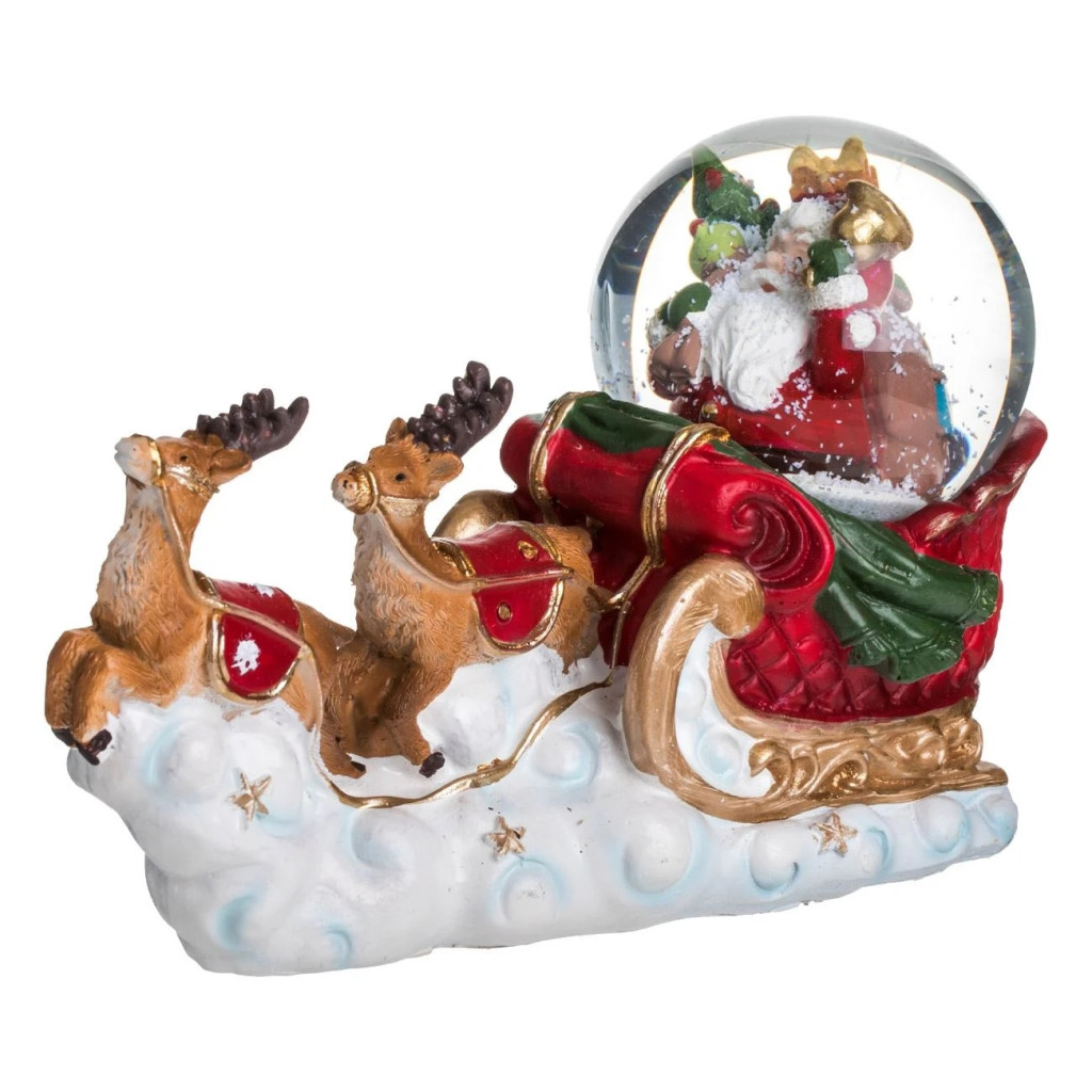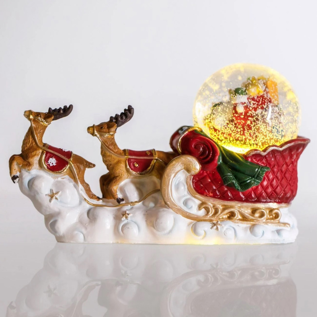 Коледна настолна декоративна шейна със снежно кълбо, фигурки на еленчета и Дядо Коледа, с LED осветление вътре в стъкленото кълбо.