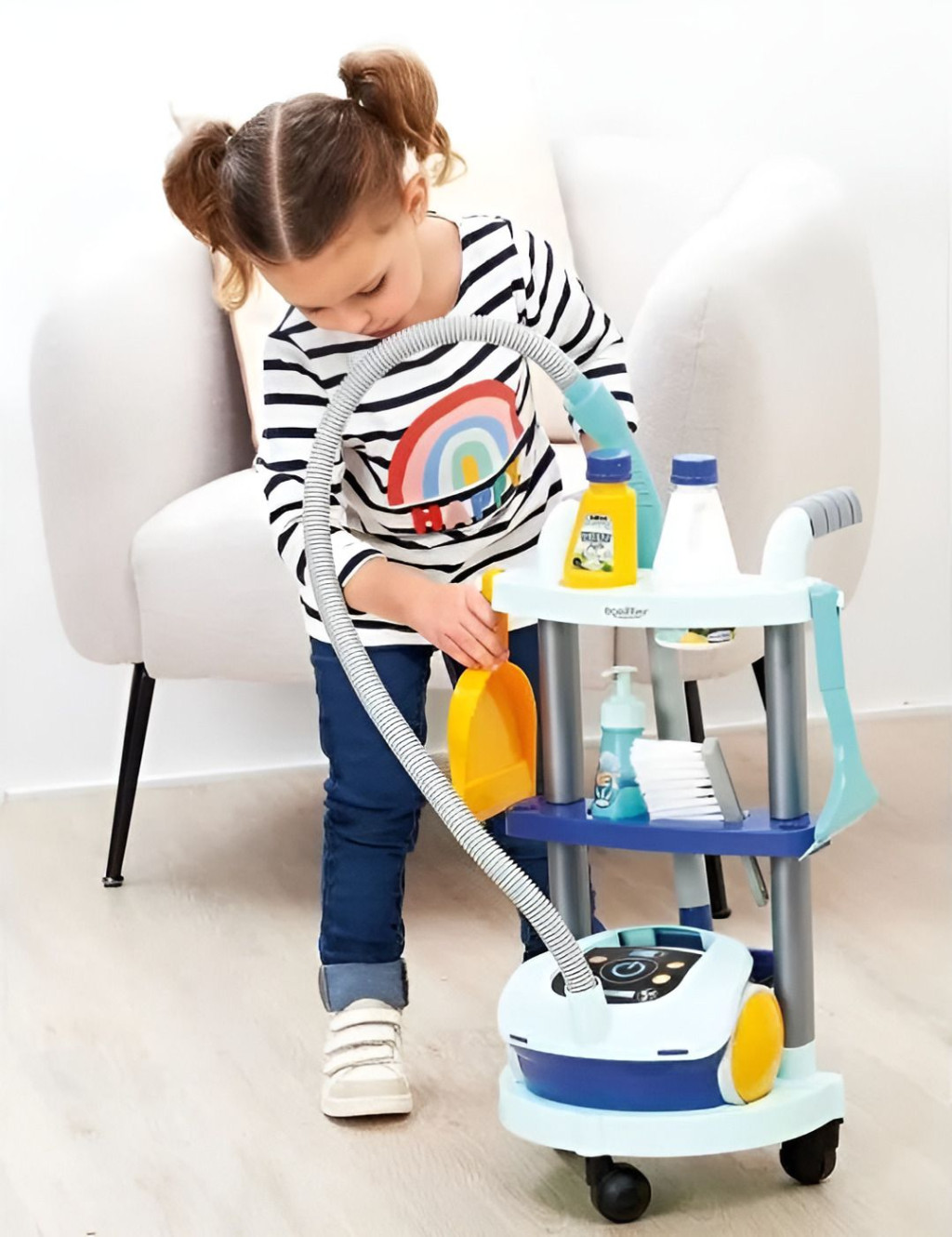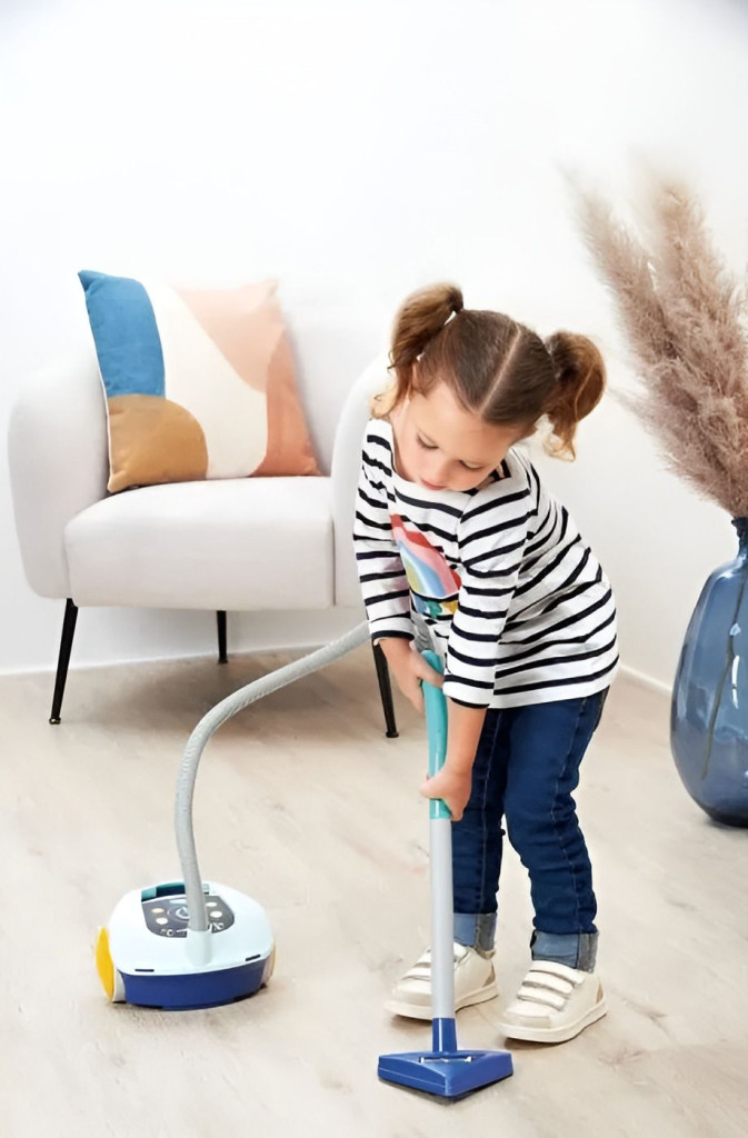 Комплектът се състои от всичко необходимо, за да бъде играта отражение на дейностите, които децата наблюдават в ежедневието си и обичат да имитират. Комплектът се състои от количка с аксесоари и копие на безжична прахосмукачка.