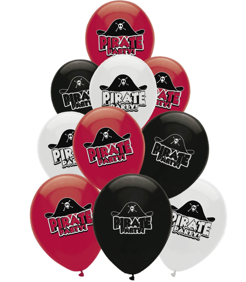 Комплект от 10 латексови балона с щампа пиратска шапка, опаковани в плик. Цветове: микс. Подходяща украса за рожден ден и различни тематични партита. За още по-ефектна декорация – използвайте в комбинация с друг вид балони.