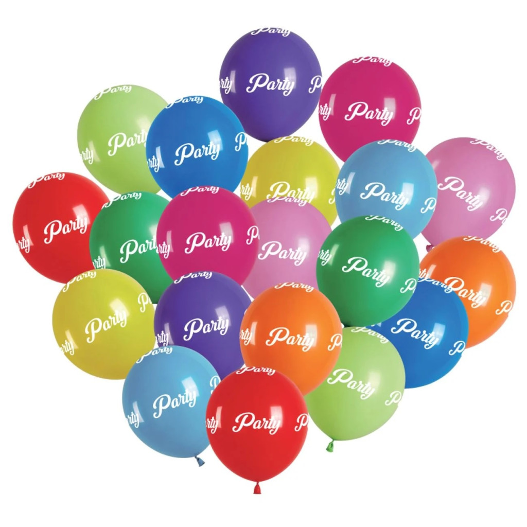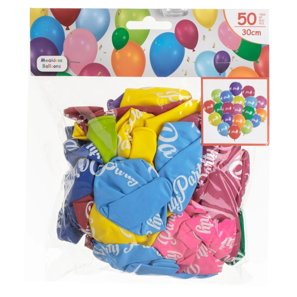 Комплект от 50 разноцветни латексови балона с надпис „Party“, идеални за празнична украса.