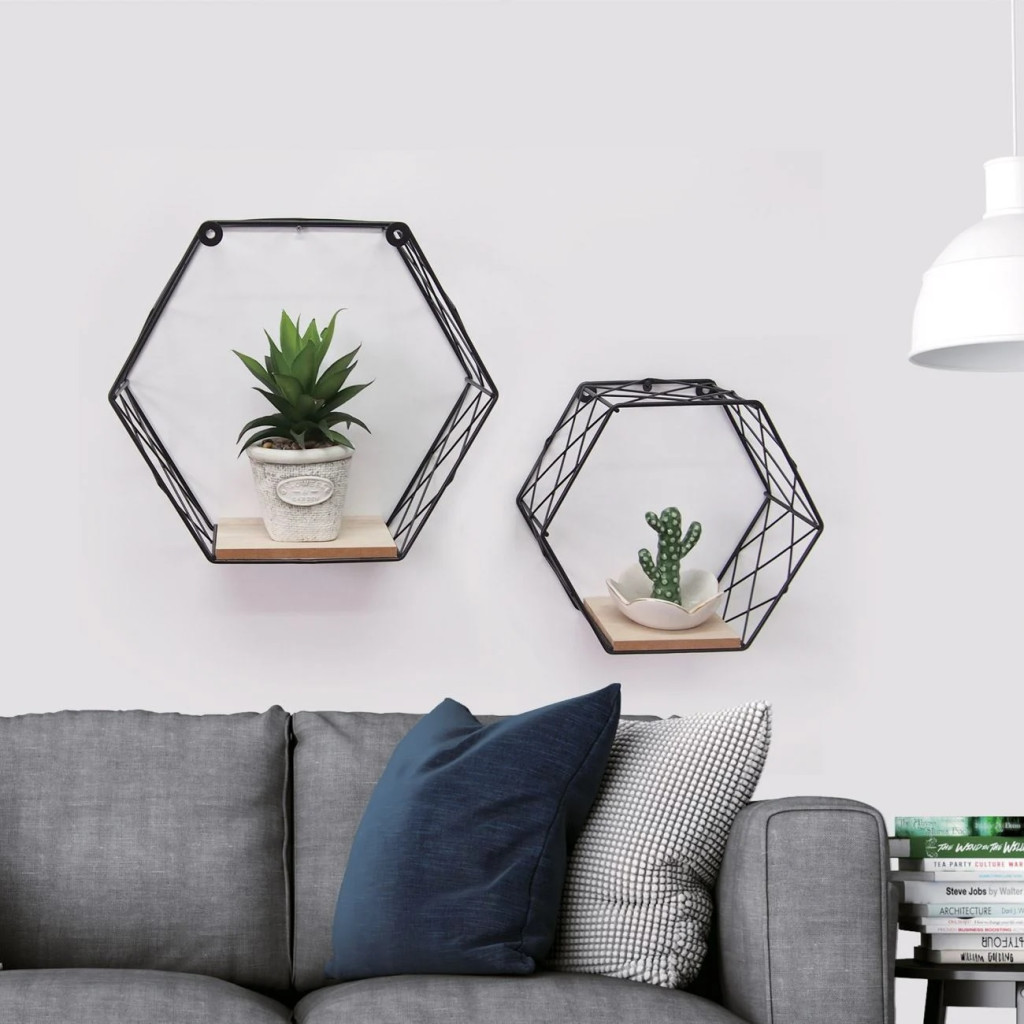 Комплект универсален рафт за стена 2бр - 2 размера, Форма Шестоъгълна, Метал и дърво, 29x10.5x25.5 - 23x10.5x20cm