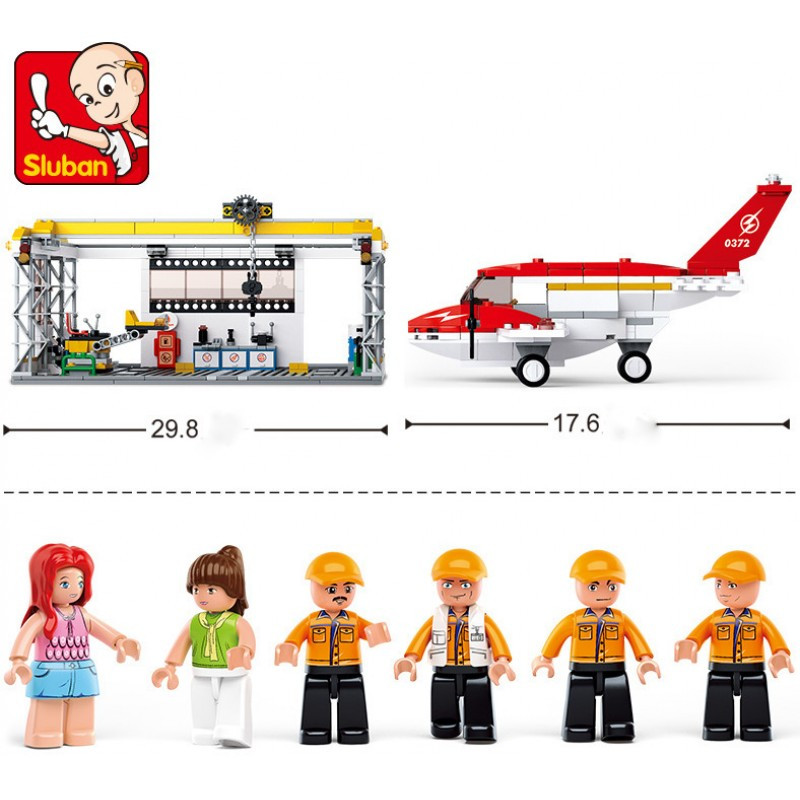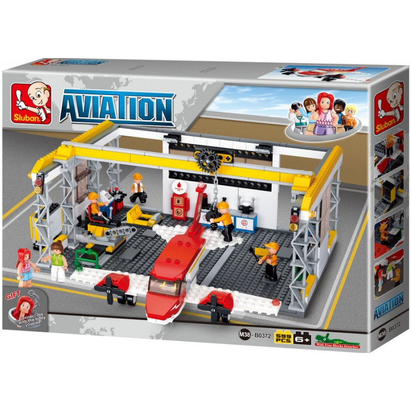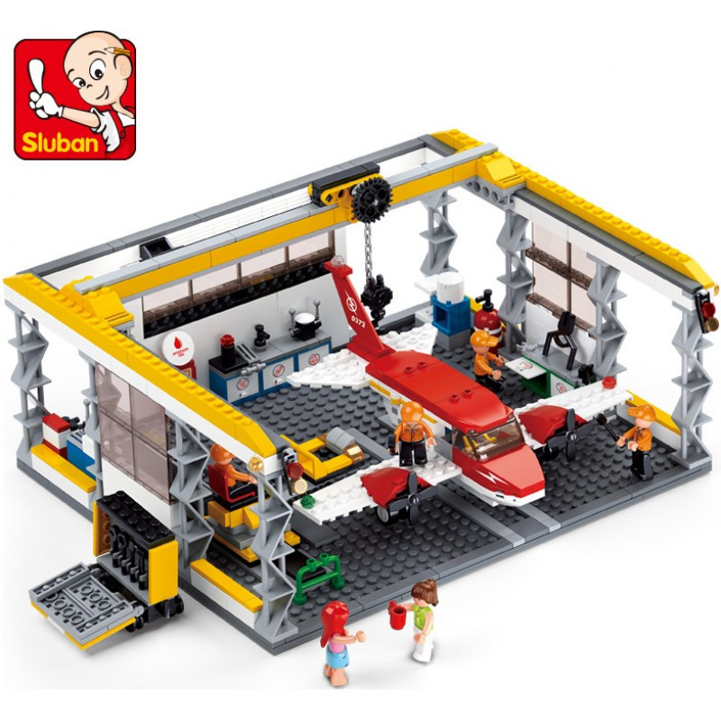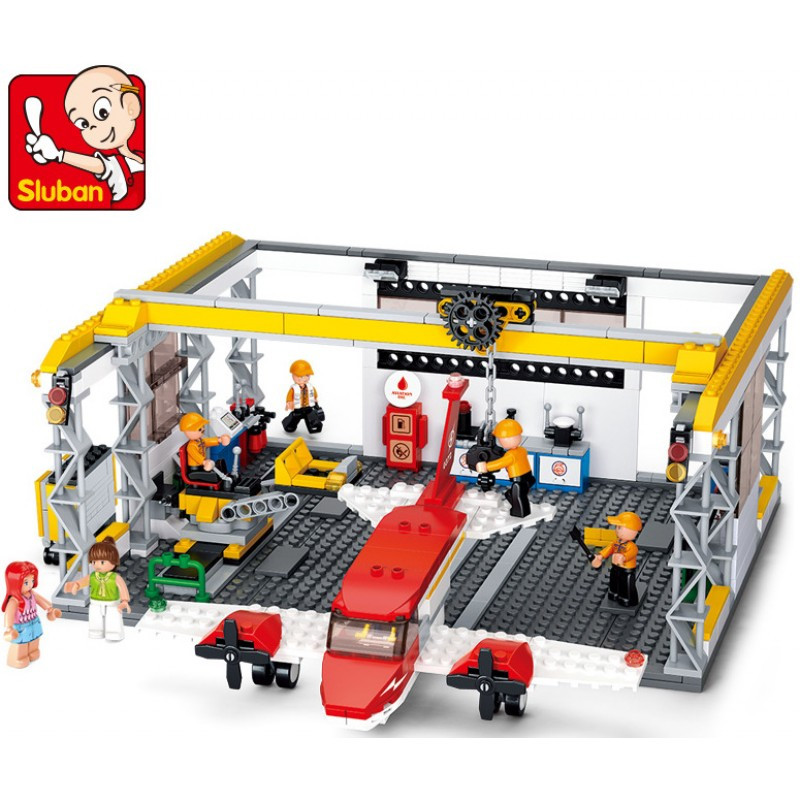 конструктор Sluban Авиация Самолет в Ремонтен Хангар 599 ел. с 6 фигурки 52х38х8