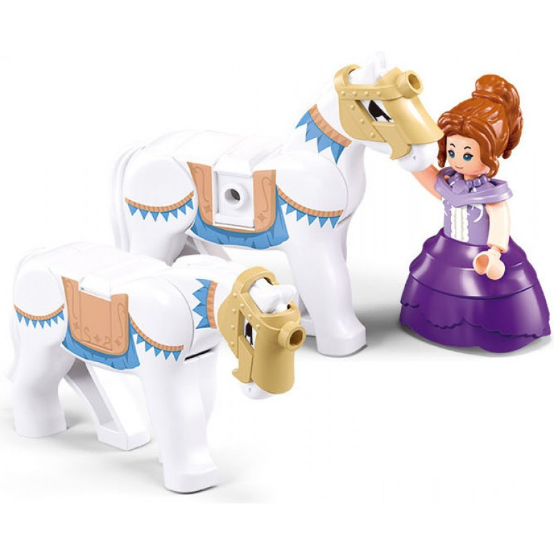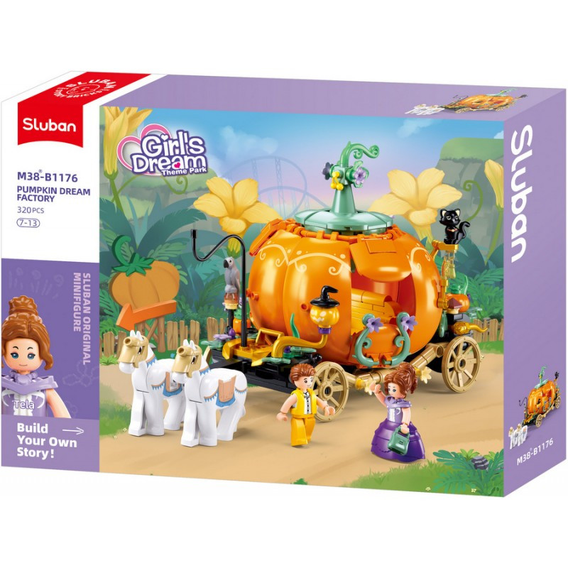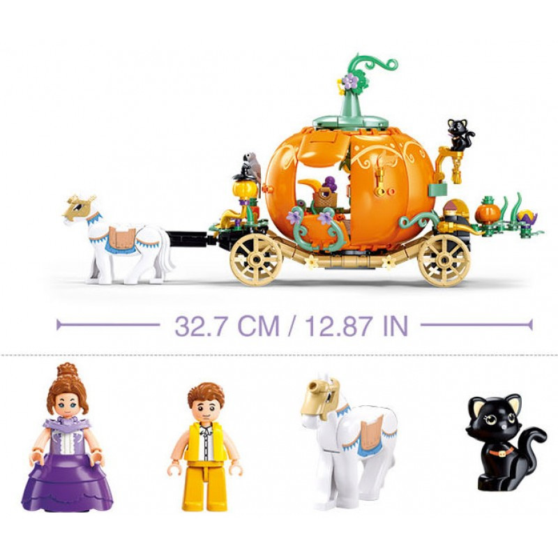 Конструктор Sluban Girl's Dream: Каретата Тиква на Пепеляшка с кончета (320 ч.) с 4 фигурки, 38х29х7 см