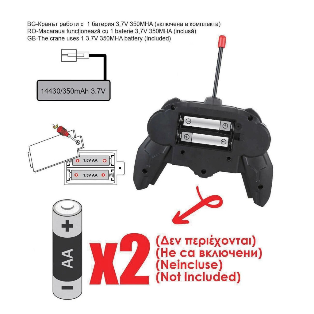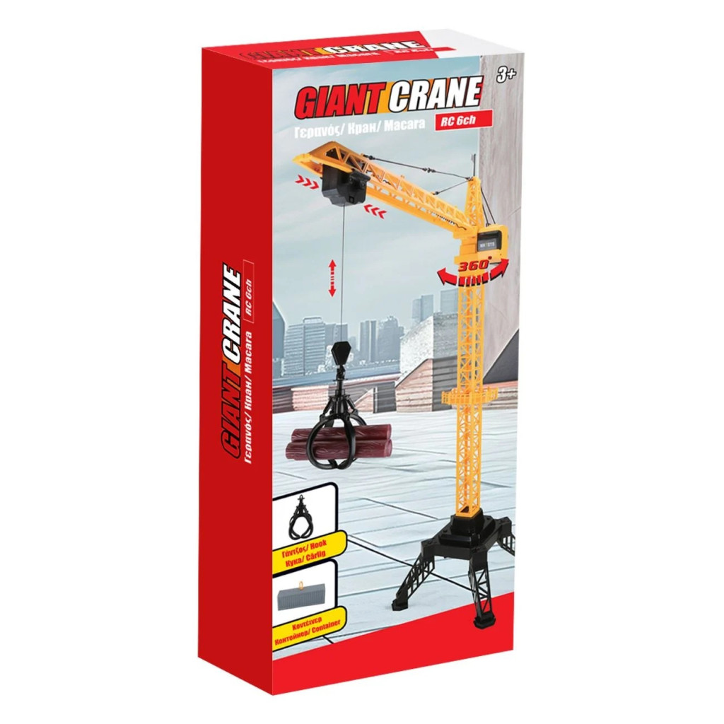 Кран с въртящ се на 360° ствол, кука, която се движи нагоре и надолу, контейнер за товарене и обща височина 120см.