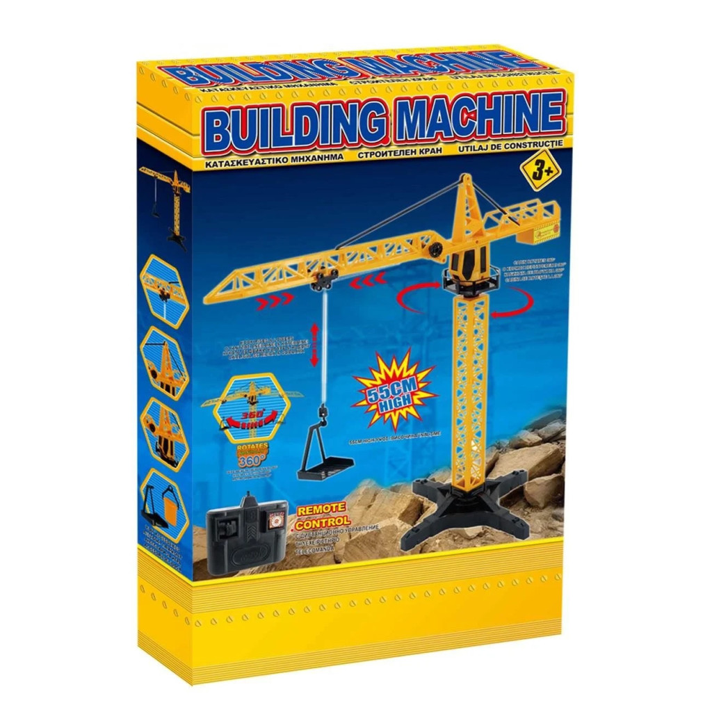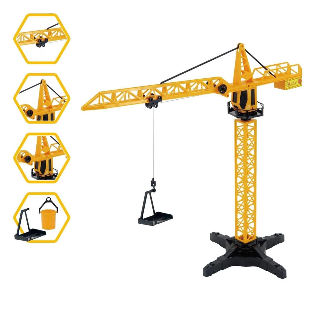 Кран с въртящо се на 360º туловище, кука, която се вдига и спуска, и обща височина 55 см.