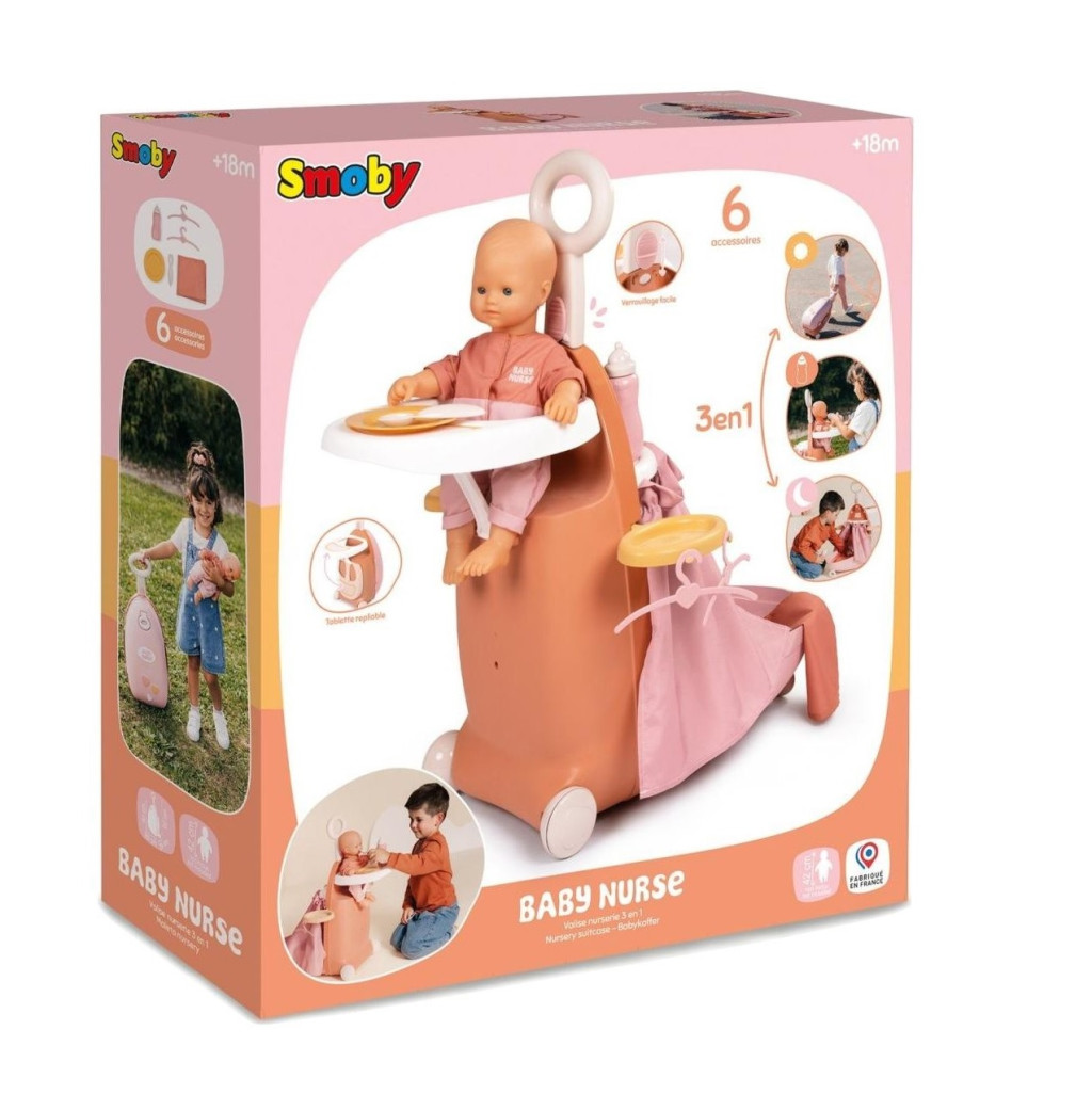 Куфар-количка за кукла-бебе с 6 аксесоара, 62 x 26 x 40 cm, Smoby Baby Nurse 3в1, 18+ месеца
