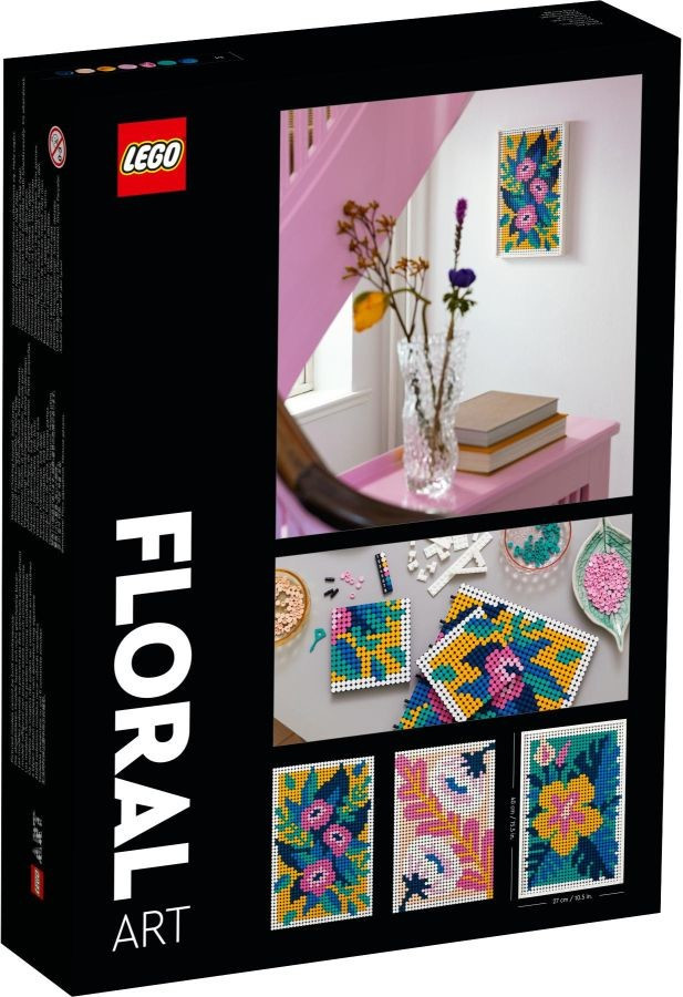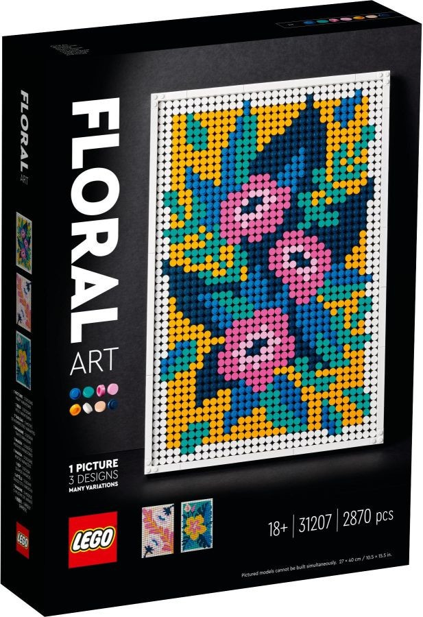 В този комплект за стена LEGO® Art Изкуство от цветя (31207) ви очаква безкрайно ботаническо творчество. Вкарайте смели цветове и възможности за дизайн в дома си, докато строите. Можете също така да оставите въображението си да разцъфти със собствен мотив. Насладете се на зона на радостен дзен, изпълнена с цветя, спокойствие и облекчаване на стреса, докато поставяте всяка част на мястото ѝ. Споделете страстта към цветята и занаятите 1 картина, 3 избора, много художествени възможности. Отворете кутията и открийте творческите възможности вътре. Изберете цветята и цветовите варианти, след това измислете дизайна, създайте и покажете. Завършете изкуството с построена от тухлички рамка в бяло, след което изложете на показ с гордост на стена или рафт. Какво ли ще създадете? Добре дошли във вашата зона на творчество. Добре дошли в комплектите LEGO за възрастни. Място за разтоварване и конструиране на детайлни модели за декорация, създадени в чест на света на изкуството, природата, развлеченията, пътешествията, игрите, спорта, науката, технологиите и историята.
