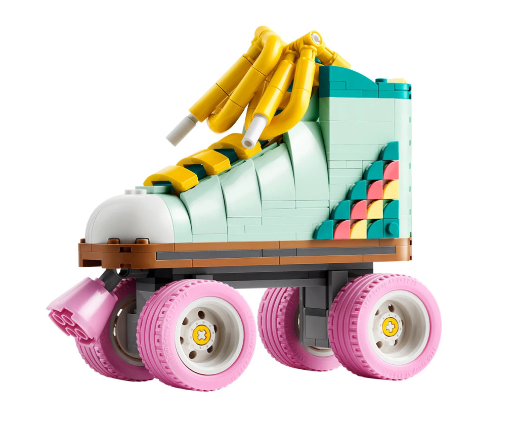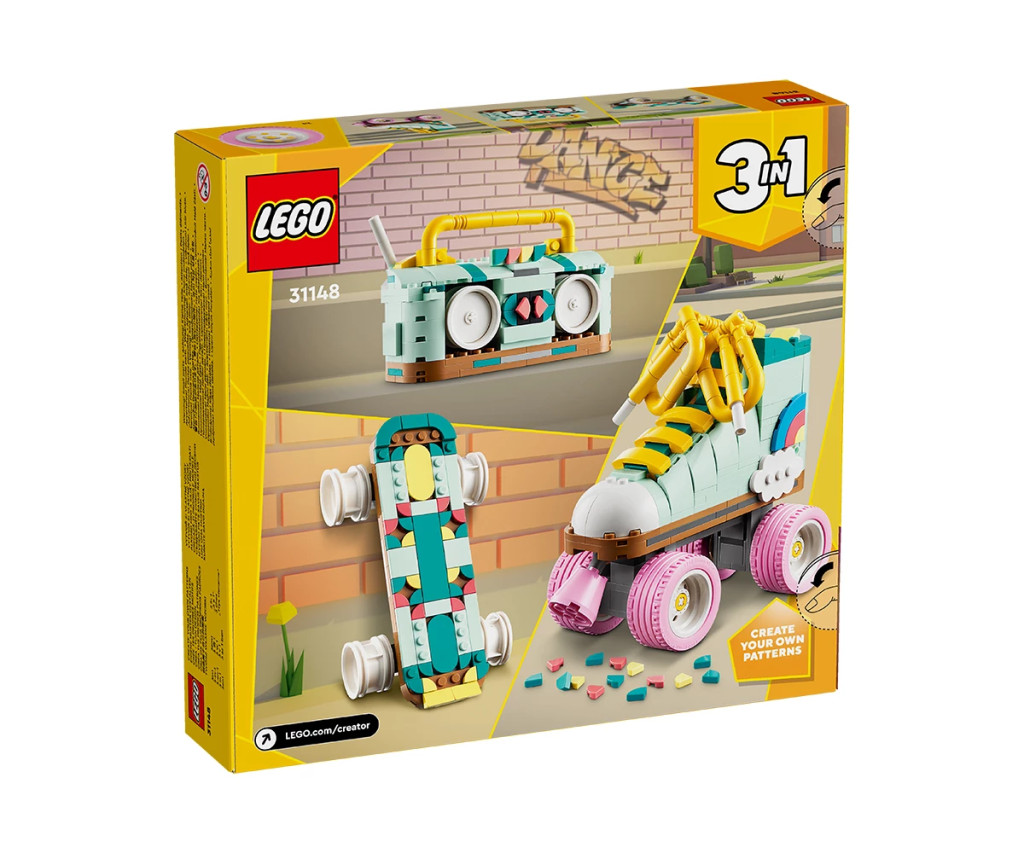 Креативни деца на възраст над 8 години могат да се върнат назад във времето с цветния строителен комплект LEGO® Creator Ретро ролкова кънка (31148). Включва ролкова кънка от LEGO с 4 движещи се розови колела, розова спирачка, дебели жълти връзки и набор от цветни части, за да могат децата да украсят петата на ботуша със собствен дизайн.