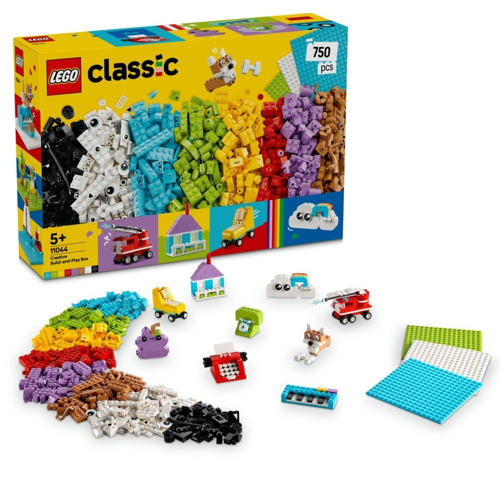Детският конструктор LEGO® Classic Творческа кутия за конструиране и игра (11044) има 750 цветни тухлички плюс много специални елементи, така че момчета и момичета на възраст над 5 години могат да се насладят на бързо забавление и безкрайно творческо строителство. Със 750 цветни тухлички, 3 основни плочки 16x16, елементи на очи, колела, прозорци и други специални елементи, този изобилстващ от игра комплект потапя децата в строително забавление. Простото ръководство разпалва креативността, като показва на децата как да създадат много страхотни модели, включително къща, куче с кокал, пожарна кола с подвижна стълба, клавиши на пиано, телефон, пишеща машина, грозде, облаци с дъга и ролкова кънка.