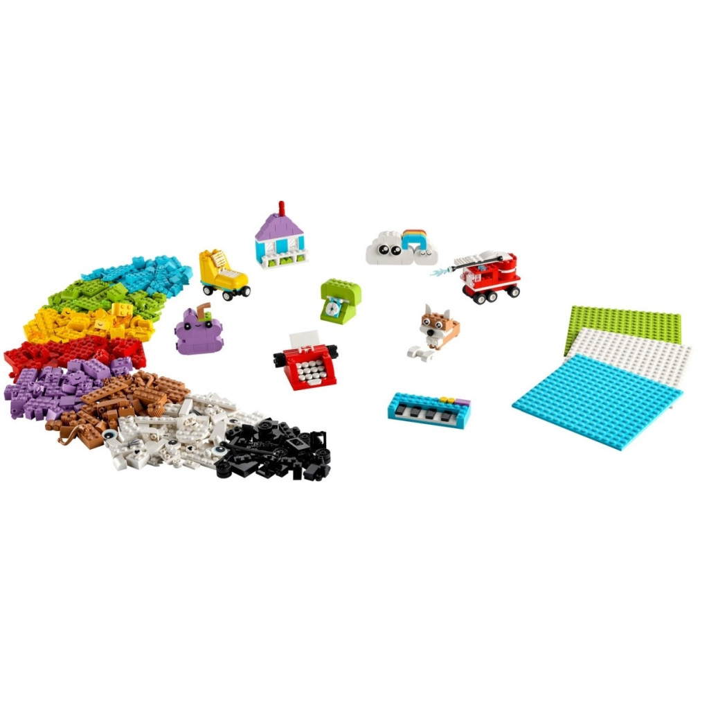 Мигновена креативност, безкрайна игра - играчките за построяване включват куче с кокал, пожарникарски камион с подвижна стълба, клавиши на пиано, къща, телефон, пишеща машина, облаци с дъга и ролкова кънка;