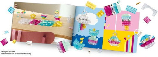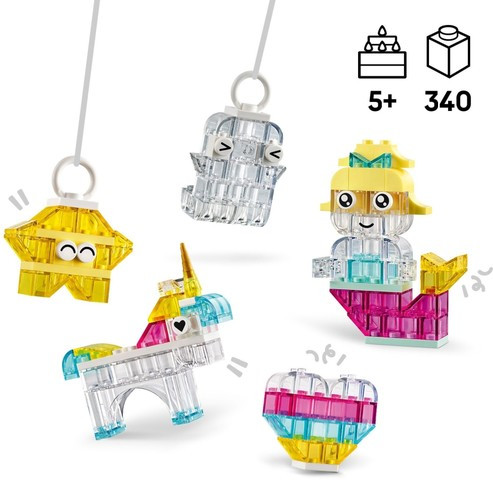 Създайте магически модели с цветни полупрозрачни тухлички! Постройте сърце, призрак, русалка, звезда, еднорог, космически кораб, облак, падаща звезда, птица, нарвал, сладолед и цвете, плюс собствени въображаеми модели. След това увеличете творческото забавление с голям замък и дракон! С тухли за закачане за създаване на висящ експонат, вашите прозрачни творения ще внесат блясък във всяка стая.