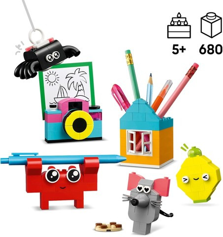 Гмурнете се в кутия с цветни тухлички LEGO® и разгърнете въображението си! Заобиколете се със забавни и функционални предмети, които сте построили сами. Закачете рисунки и съобщения на моделите и ги окачете на стената, за да ги видят всички. Не забравяйте да завършите LEGO творенията си с усмихнати лица – защото LEGO Classic Творческа кутия на щастието е извор на забавление и супер креативност!