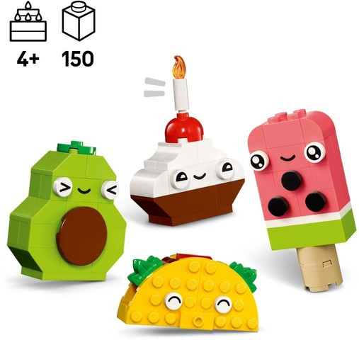 LEGO® Classic Творчески храни (11039) е универсален строителен комплект за деца на възраст над 4 години. С включените забавни храни, тази въображаема играчка е идеална за игра наужким. С безкрайни възможности за изграждане, промяна и забавно свободно конструиране, този комплект LEGO за начинаещи развива увереността, концентрацията и уменията за решаване на проблеми у децата. Децата използват цветния и завладяващ асортимент от строителни тухлички и специални части – като очи, уста и различни декоративни елементи – за да създадат 4 сладки играчки храни: кексче, сладолед, авокадо и тако. Творческото забавление продължава, докато децата смесват тухличките, за да превърнат моделите в торта с поръски, чай с мехурчета, круша и панини. Когато децата станат по-уверени в своите строителни умения, те могат да следват интуитивното ръководство за построяване, за да променят израженията, формите или цветовете и да създават нови храни, включително зелен сладолед, кутия със сок, резен диня, шоколад и мега сандвич.