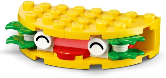 Всички храни на масата! Забавлявайте се със сладко кексче за построяване, сладолед, авокадо и тако! След това смесете тухличките, за да ги превърнете в торта с поръски, чай с мехурчета, круша и панини! След това отново разбъркайте тухличките, за да създадете безкрайни възможности, включително зелен сладолед, кутия със сок, резен диня, шоколад и мега сандвич!