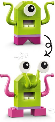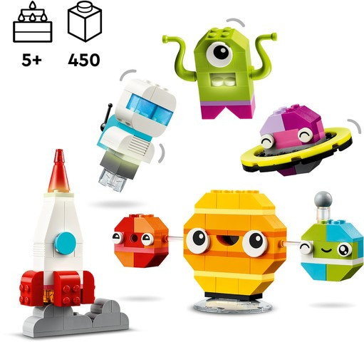Децата сглобяват цветните тухлички, за да построят ракета, извънземно, астронавт и мини слънчева система, включваща Марс, Земята, Слънцето и Сатурн с неговите пръстени. След това космическите модели могат да бъдат персонализирани с помощта на алтернативни цветове, форми, очи, изражения и стойка, която позволява на модела да се върти. Има дори светещи в тъмното тухлички, за да се виждат през нощта. Космическото творчество продължава с предложения за алтернативни конструкции, включително пълна слънчева система с 8 планети. Ръководствата и цифровите функции са достъпни и в приложението LEGO Builder.