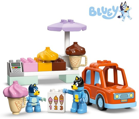Комплект за игра с щанд за сладолед и превозно средство, вдъхновени от ТВ сериала Блуи – пренесете децата в предучилищна възраст в забавния свят на семейство Хийлър с играчката за малки деца LEGO® DUPLO® Bluey Сладоледено приключение с Блуи;